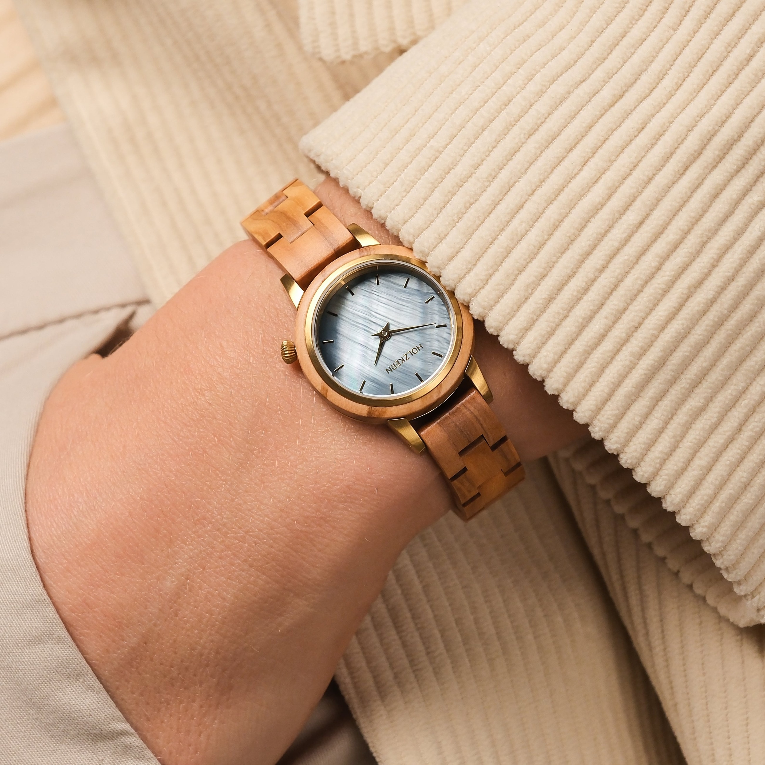 Denna otroliga resa fylld av fantastiska sevärdheter är inspirationen till vår unika modell Antrim av olivträ och blå pärlemor.