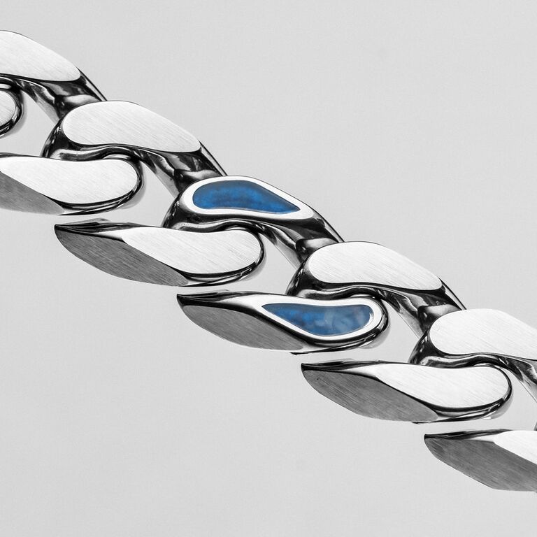 Karakteristiska kedjor i rostfritt stål som smyger svala och glänsande runt din handled utgör basen för detta armband . Regelbundna fina kontrastdetaljer i äkta sodalit ger naturlig struktur, färg och karaktär, men armbandet tål vatten tack vare vår innovativa Hydro-Defense-beläggning.