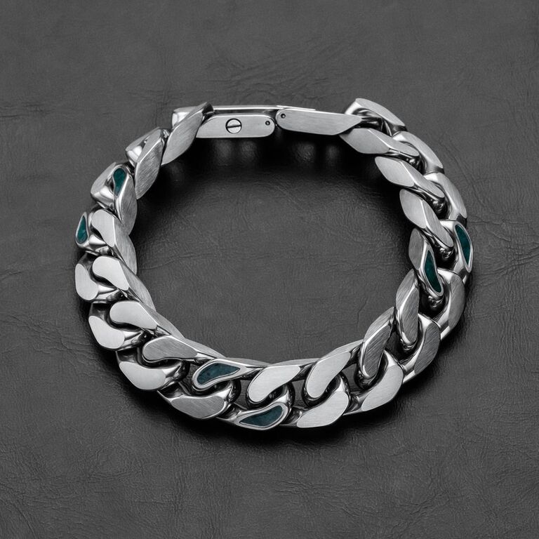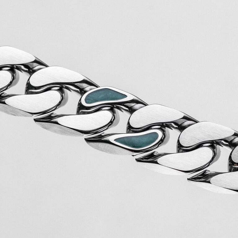 Karakteristiska kedjor i rostfritt stål som smyger svala och glänsande runt din handled utgör basen för detta armband . Regelbundna fina kontrastdetaljer i äkta turkossten ger naturlig struktur, färg och karaktär, men armbandet tål vatten tack vare vår innovativa Hydro-Defense-beläggning.