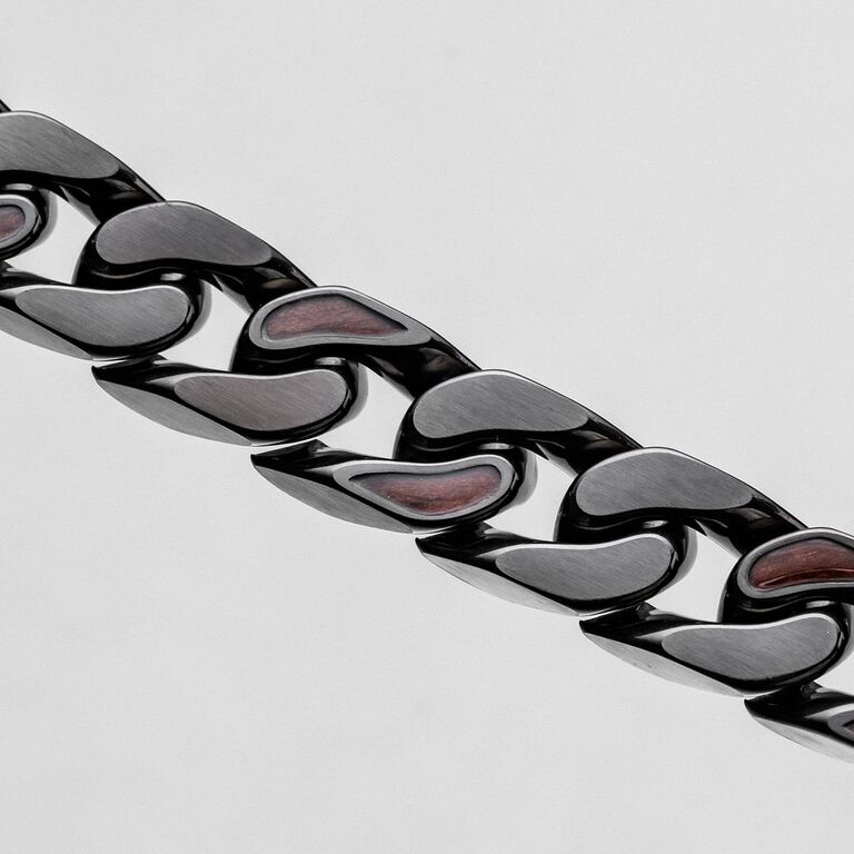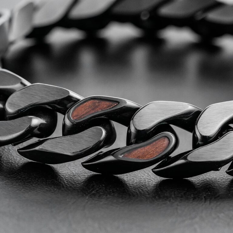 Karakteristiska kedjor i rostfritt stål som smyger svala och glänsande runt din handled utgör basen för detta armband . Regelbundna fina kontrastdetaljer i äkta valnötsträ ger naturlig struktur, färg och karaktär, men armbandet tål vatten tack vare vår innovativa Hydro-Defense-beläggning.