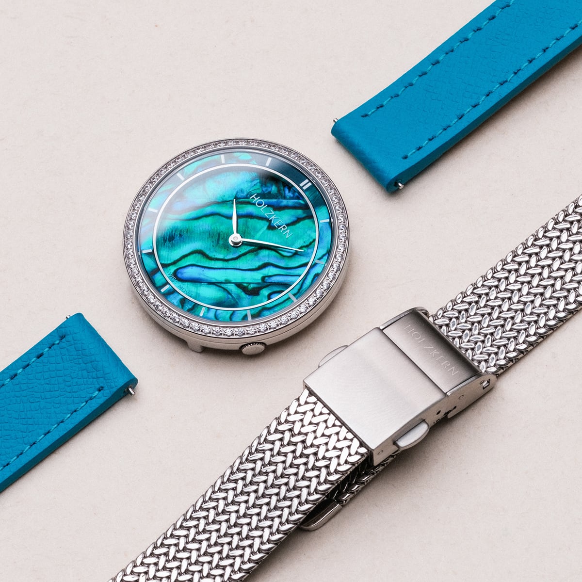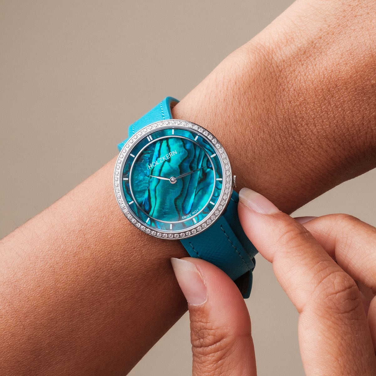 Inspired by the vibrant underwater world of coral reefs, our Coralline women's watch brings together iridescent abalone, lustrous stainless steel, and sparkling zirconia to create a unique display of colours.