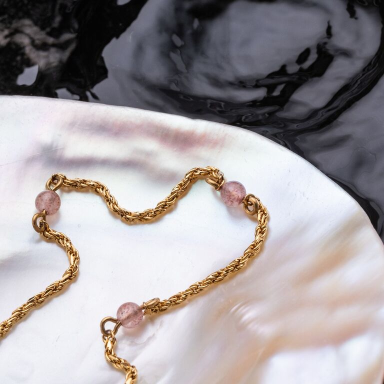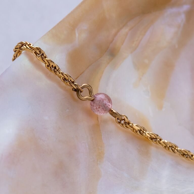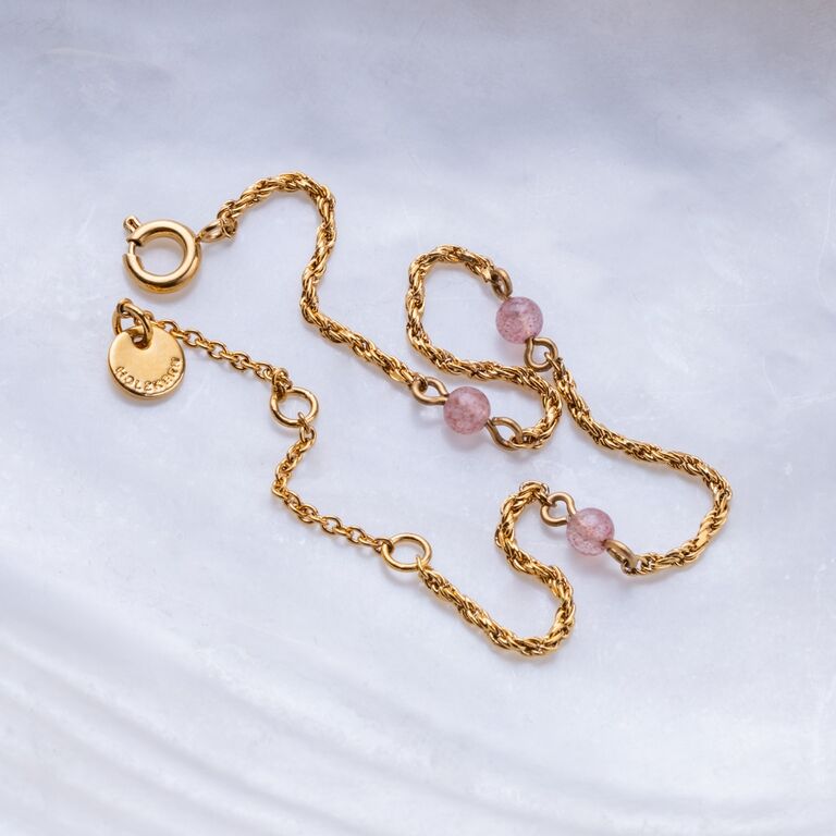 Dewdrops-armbandet fångar magin i ett stilla ögonblick: 18k guldpläterad mässing möter äkta solsten vars varma glans påminner om gyllene morgonstrålar och ger ny energi.