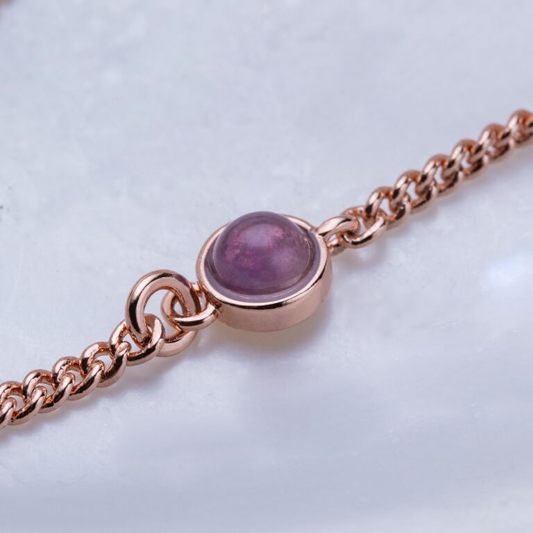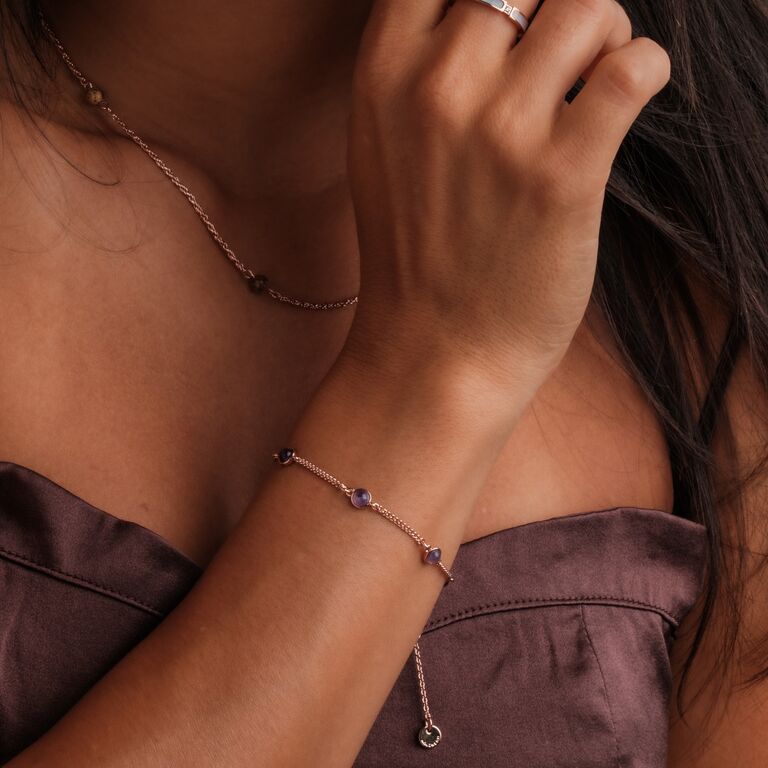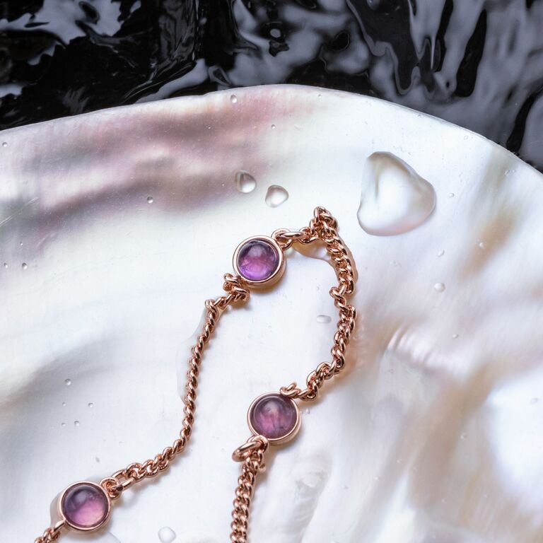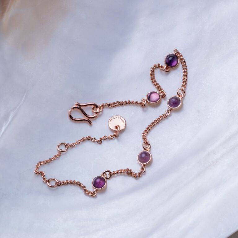 Vårt Dewdrops-armband fångar magin i ett stilla morgon: roséguldpläterad mässing med äkta ametist vars violetta glans utstrålar både lugn och styrka.