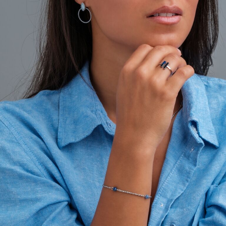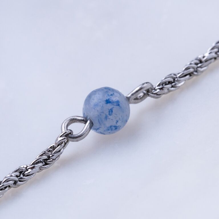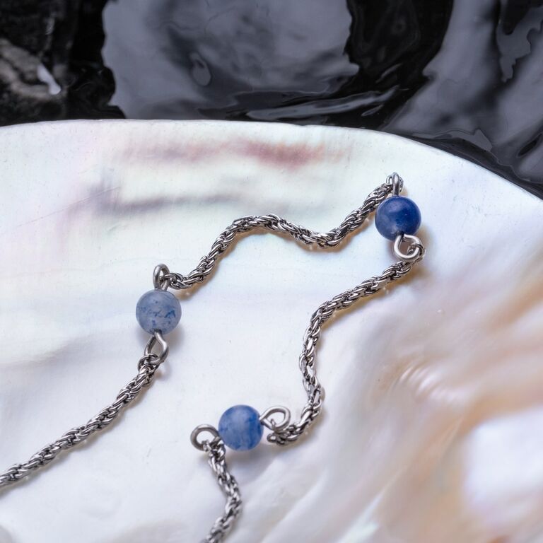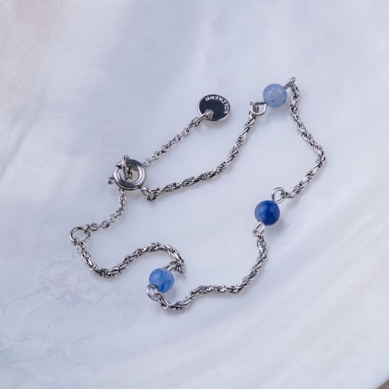 Dewdrops-armbandet fångar magin i ett stilla ögonblick: silverglänsande mässing med äkta aventurin – en ädelsten i en mjuk blå färg som står för hopp, lugn och nystart.