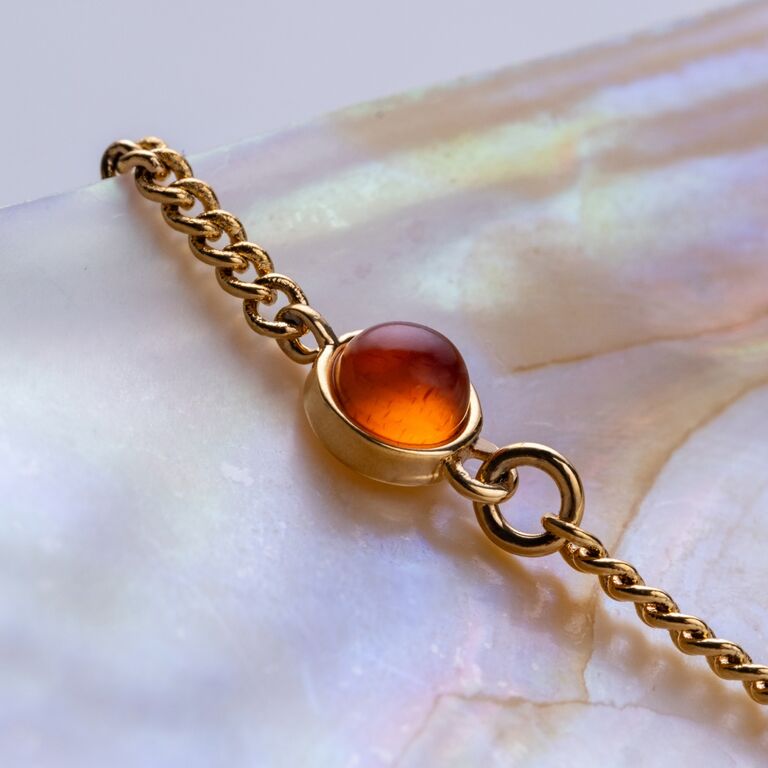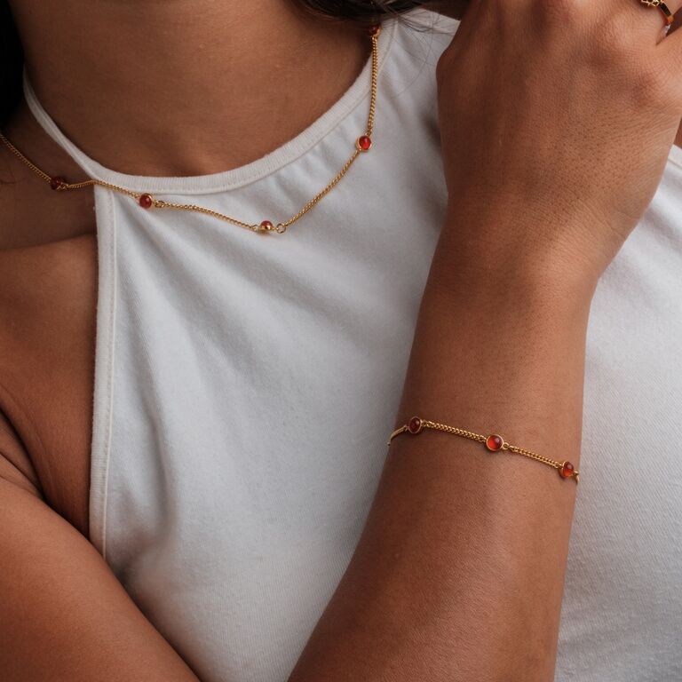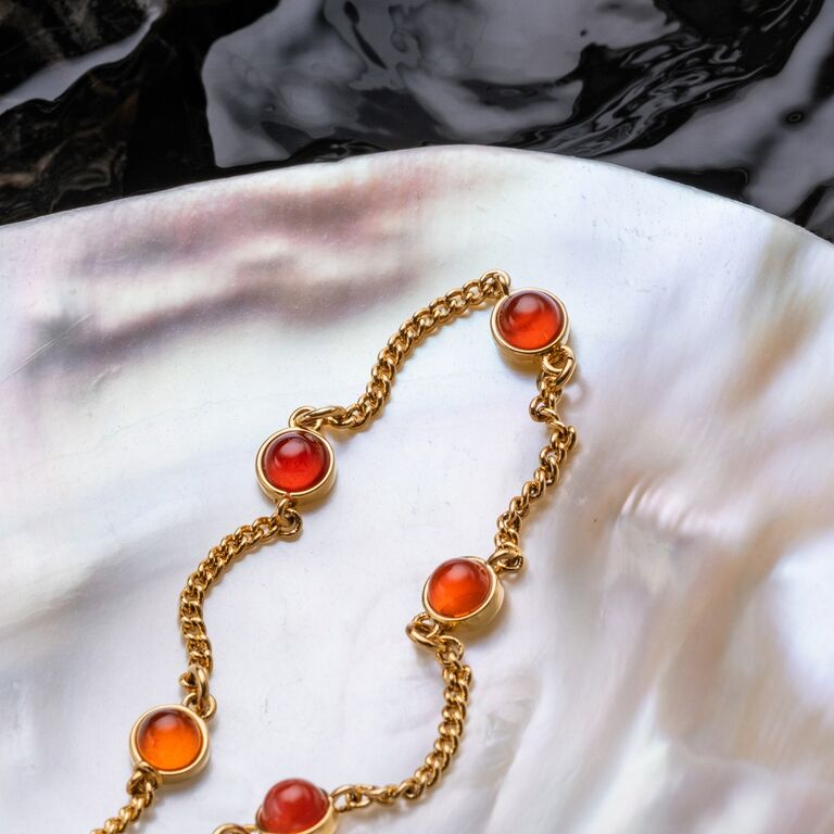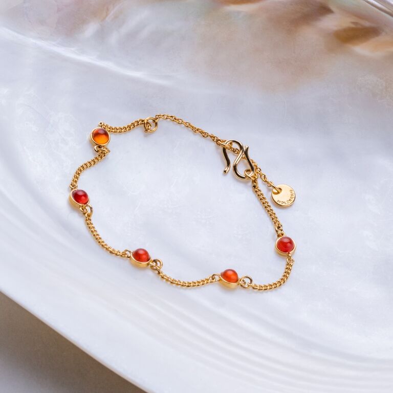 Vårt Dewdrops-armband fångar magin i en stilla morgon: 18k guldpläterad mässing med äkta orange kalcedon som skimrar som en varm ljusstråle på huden.