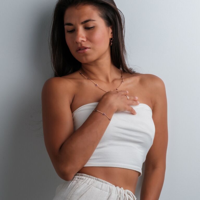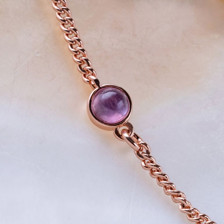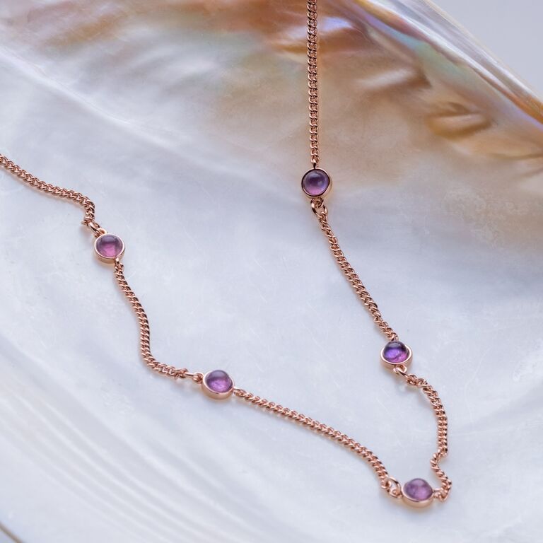 Vårt Dewdrops-halsband fångar magin i en stilla morgon: roséguldpläterad mässing med äkta ametist vars violetta glans utstrålar både lugn och styrka.