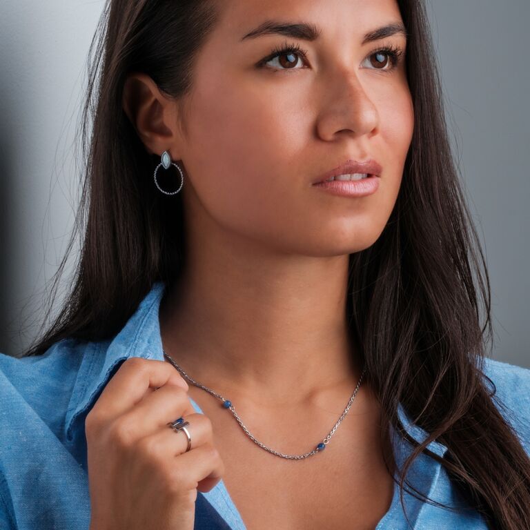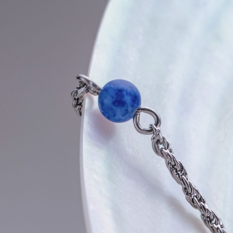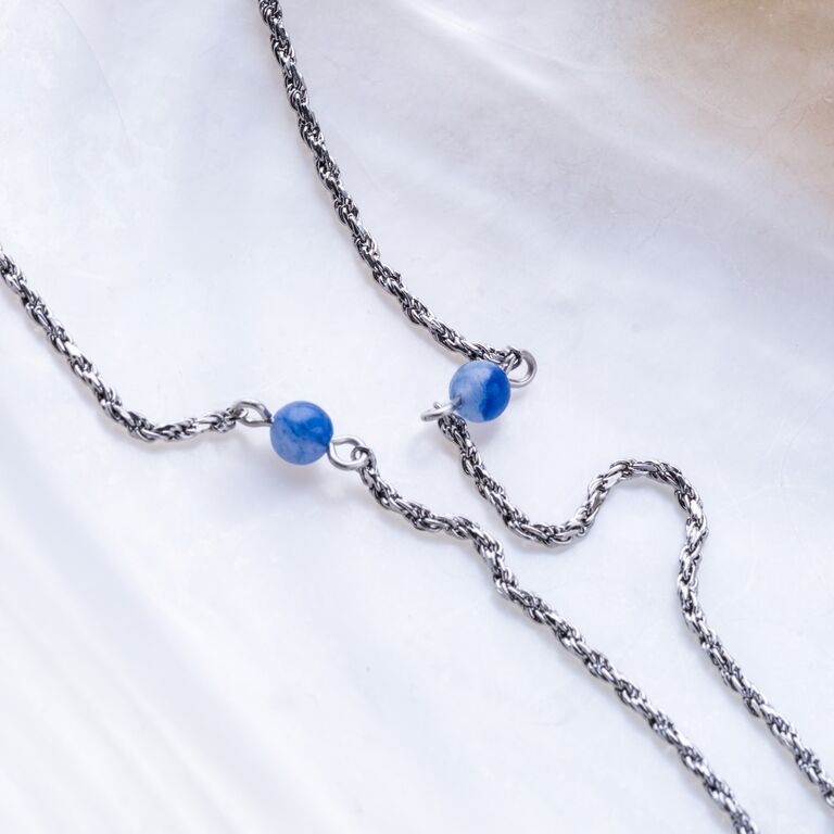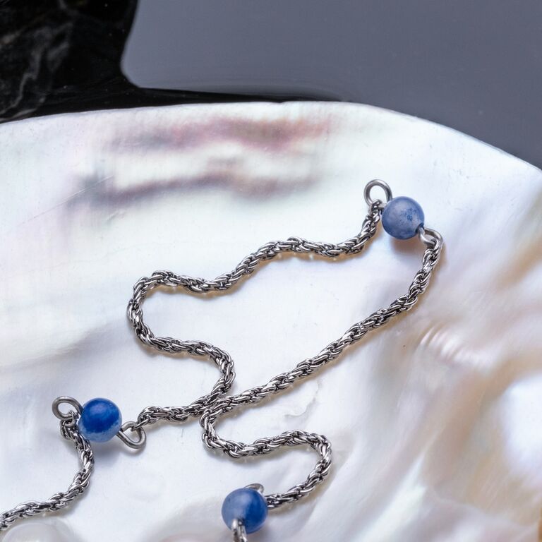 Dewdrops-halsbandet fångar magin i ett stilla ögonblick: silverglänsande mässing med äkta aventurin – en ädelsten i en mjuk blå färg som står för hopp, lugn och nystart.
