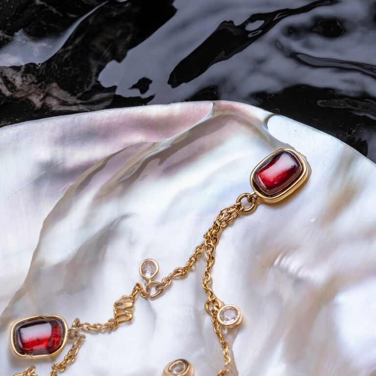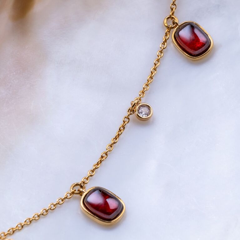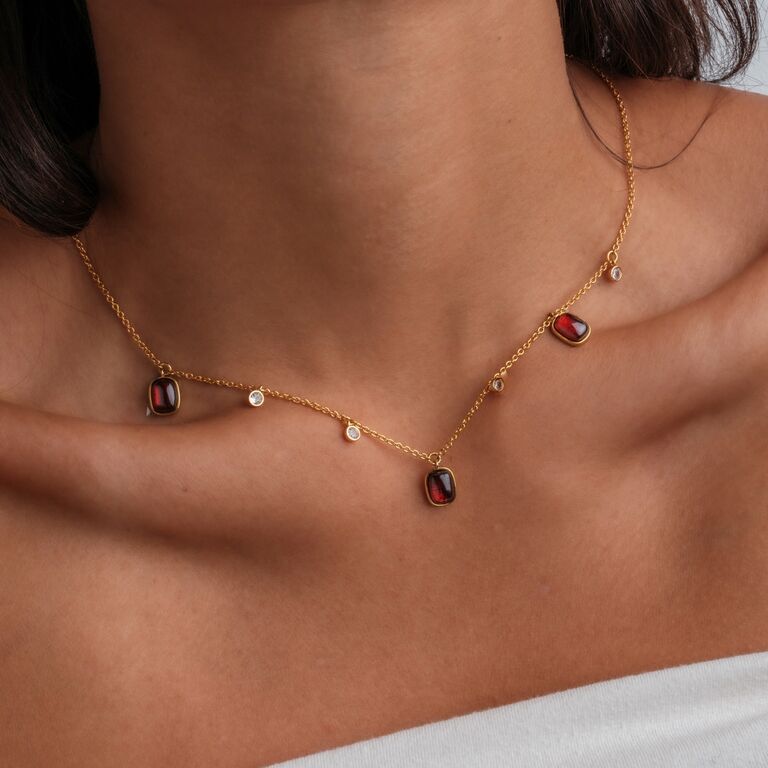 Dewdrops-halsbandet fångar magin i ett stilla ögonblick: 18 karat guldpläterad mässing tillsammans med äkta granat ger dig en extra passionerad kraft till ditt dekolletage.