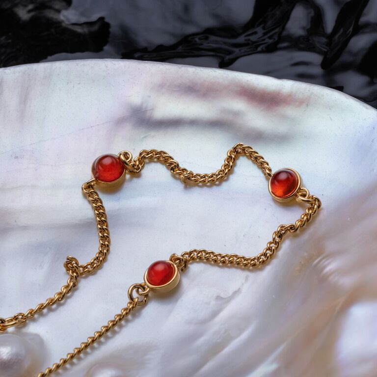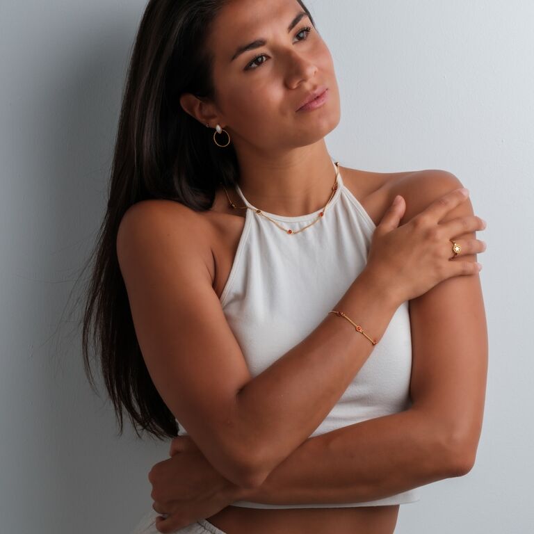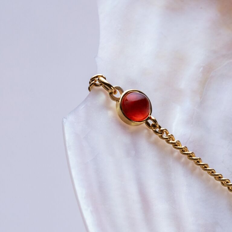 Vårt Dewdrops-halsband fångar magin i en stilla morgon: 18k guldpläterad mässing med äkta orange kalcedon som skimrar som en varm ljusstråle på huden.
