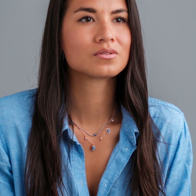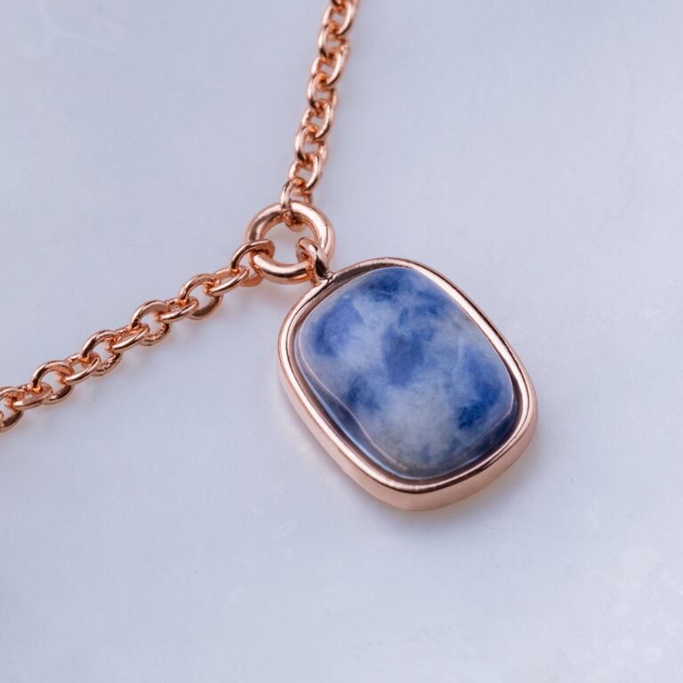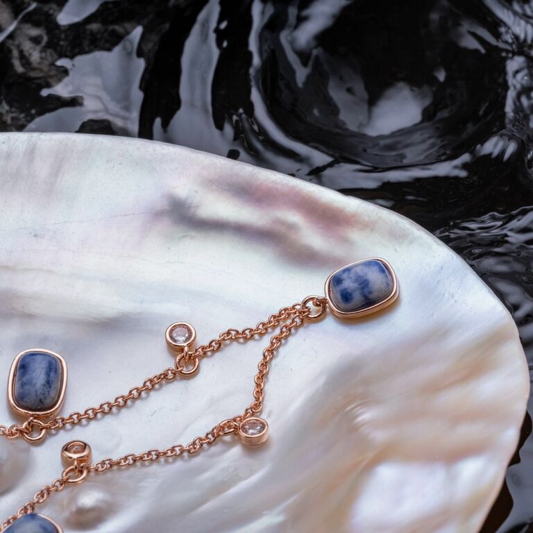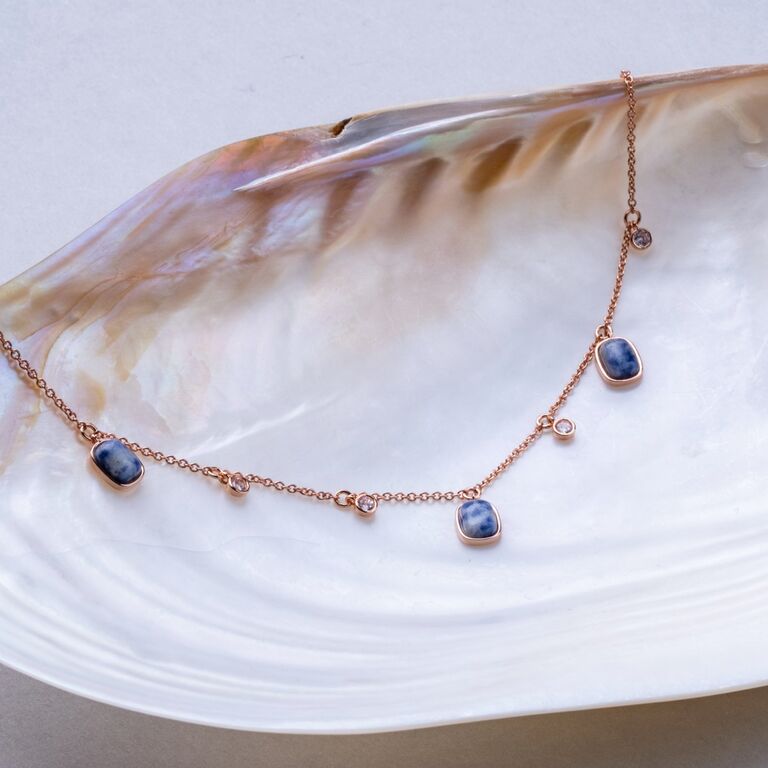 Dewdrops-halsbandet fångar magin i ett stilla ögonblick: roséguldpläterad mässing och äkta sodalit ger lugn och uttrycksfullhet till ditt dekolletage.