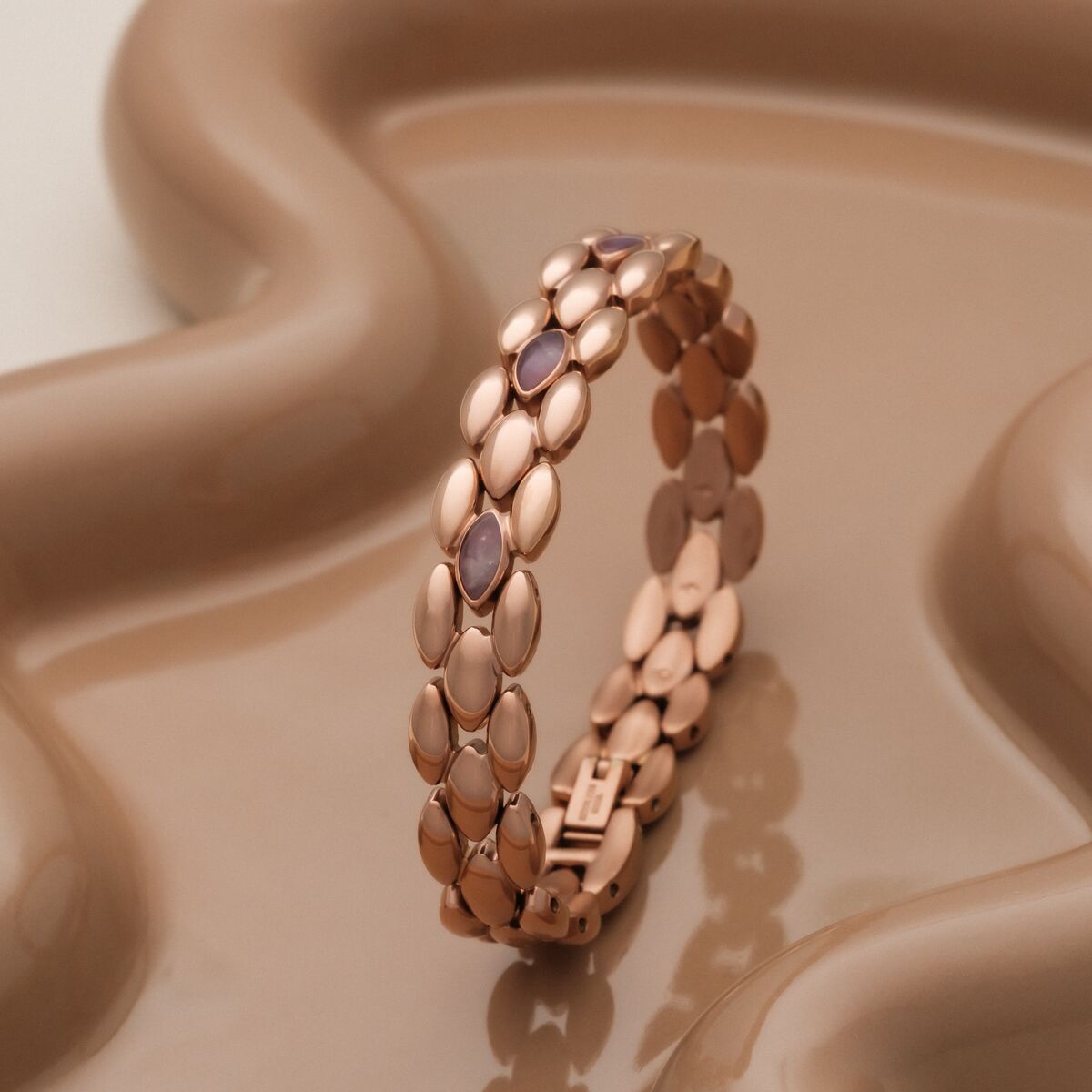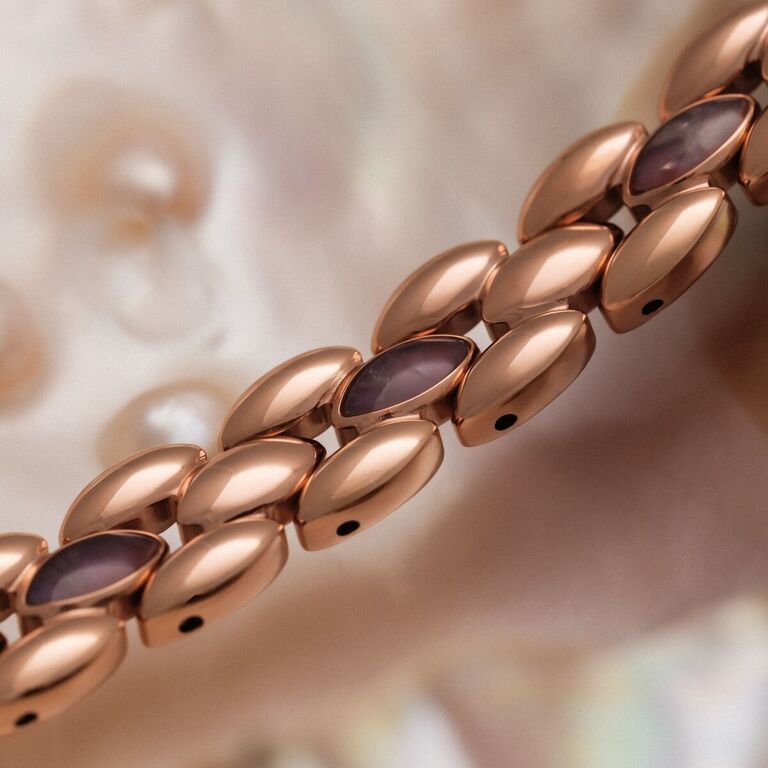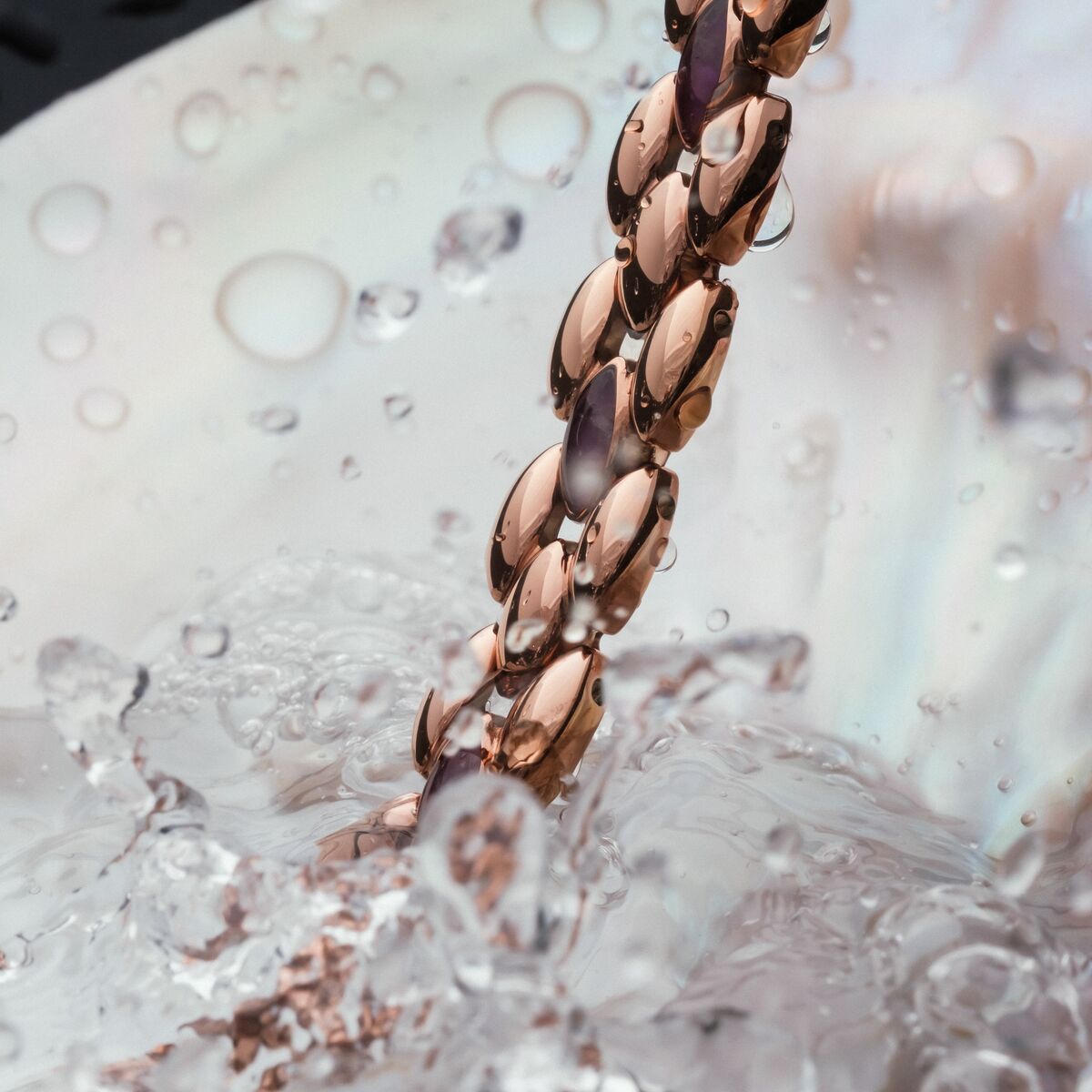 Ur denna stämning har vårt armband Fairylights fötts. En mjuk roséton möter mystisk ametist där naturens skönhet förenas med tåligt rostfritt stål. Tack vare Hydro-Defense är armbandet dessutom garanterat vattentåligt och lika beständigt som den magi det bär inom sig.