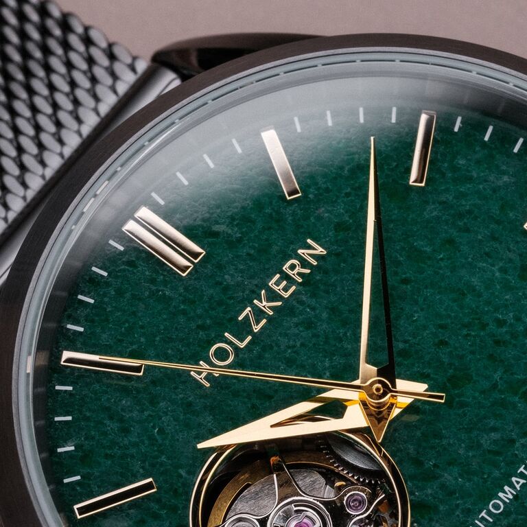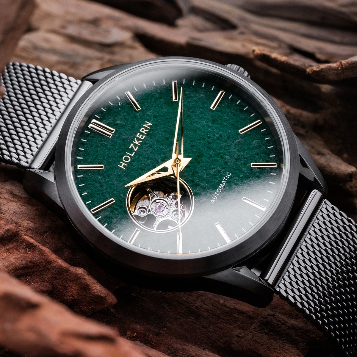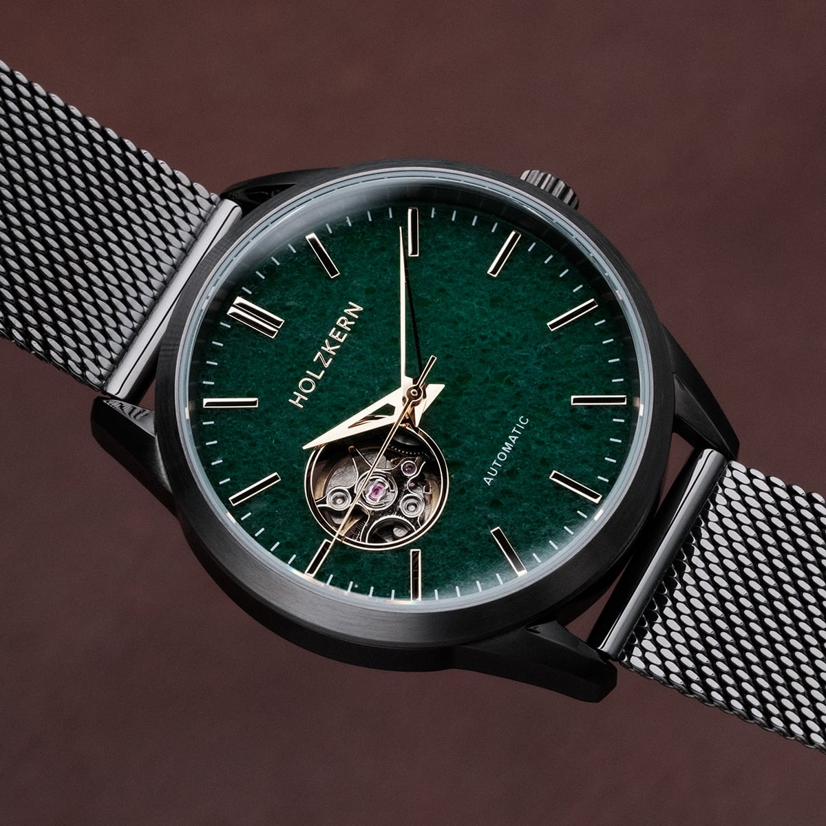 Som et inferno i kølige nuancer af grøn og grå fremstår dette automatiske ur som et anderledes bål. Ikke flammende luer og gnister, men en glødende puls der er stille og skjult, men samtidig stærk og uimodståelig.