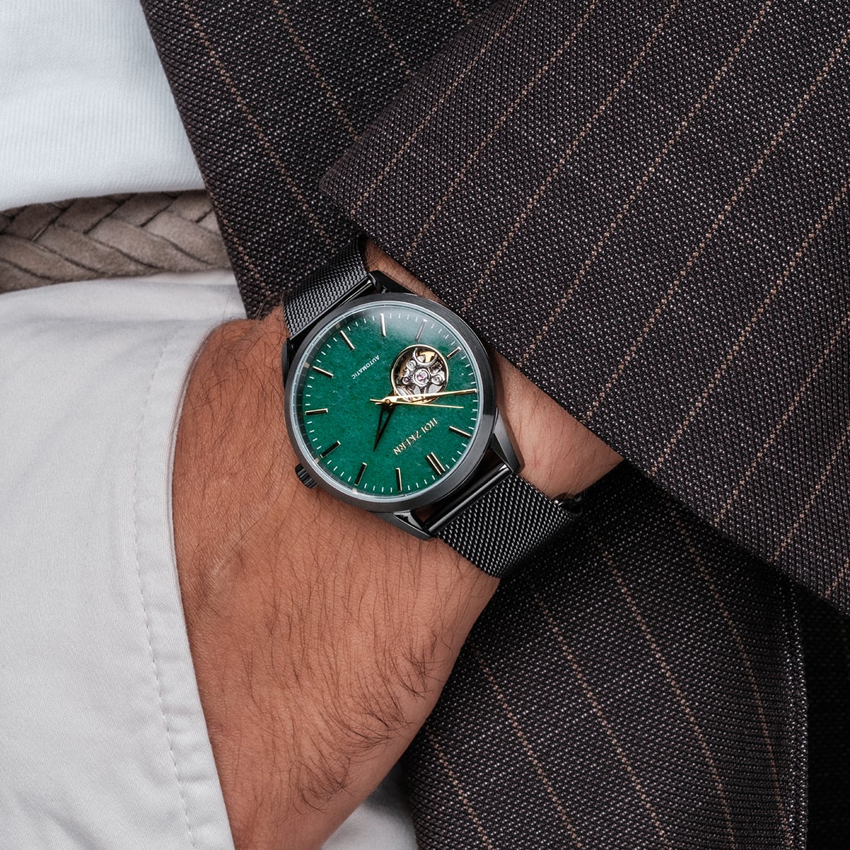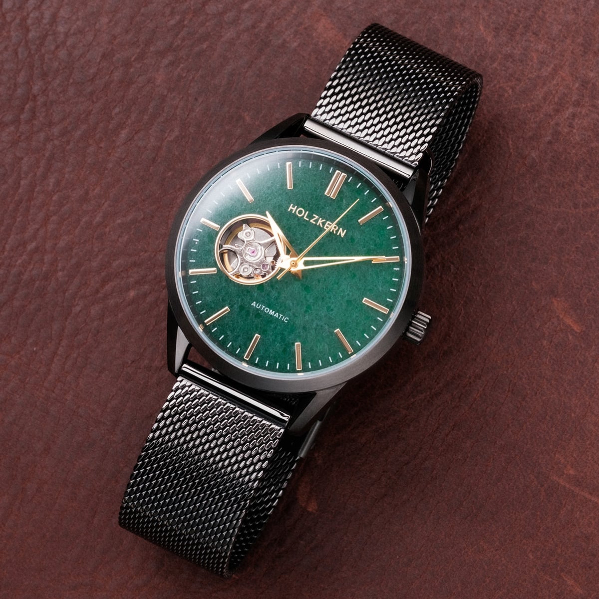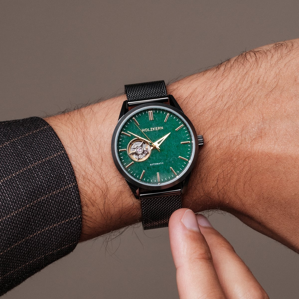 Som et inferno i kølige nuancer af grøn og grå fremstår dette automatiske ur som et anderledes bål. Ikke flammende luer og gnister, men en glødende puls der er stille og skjult, men samtidig stærk og uimodståelig.