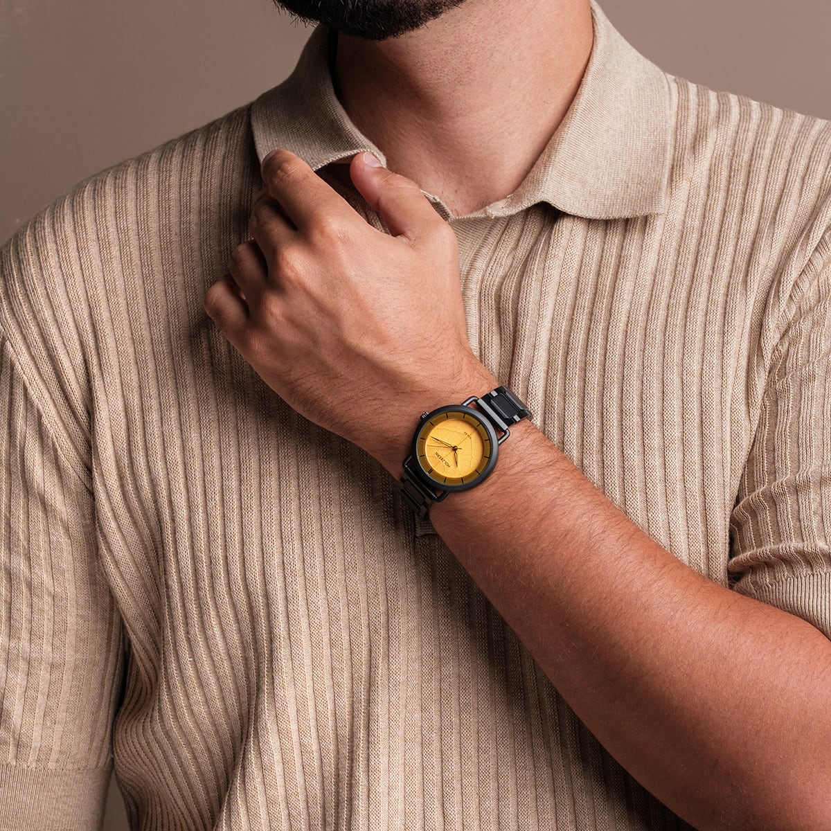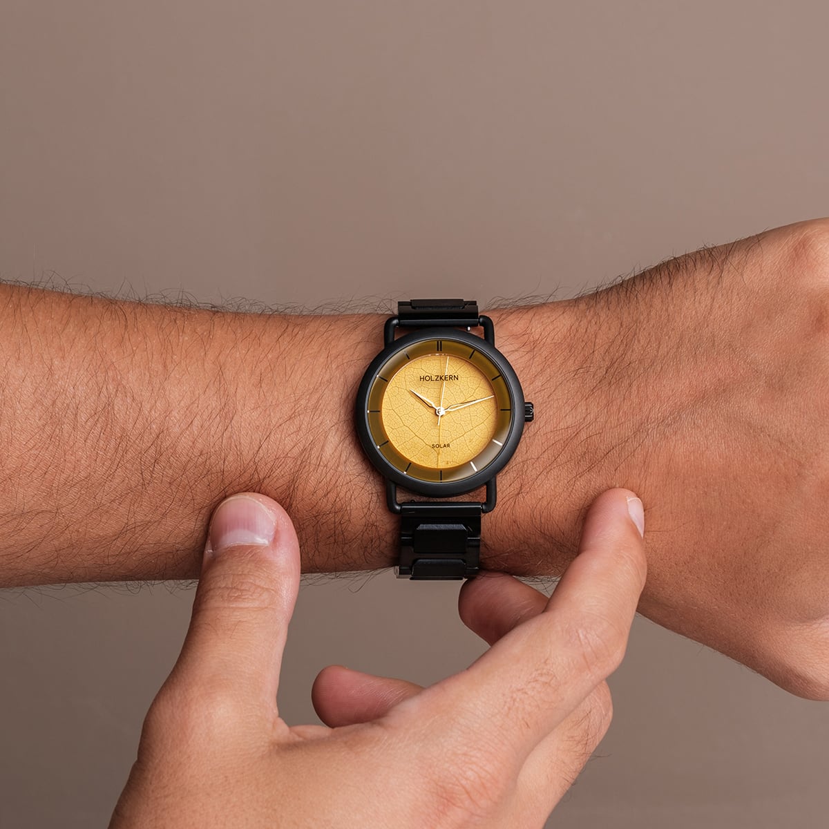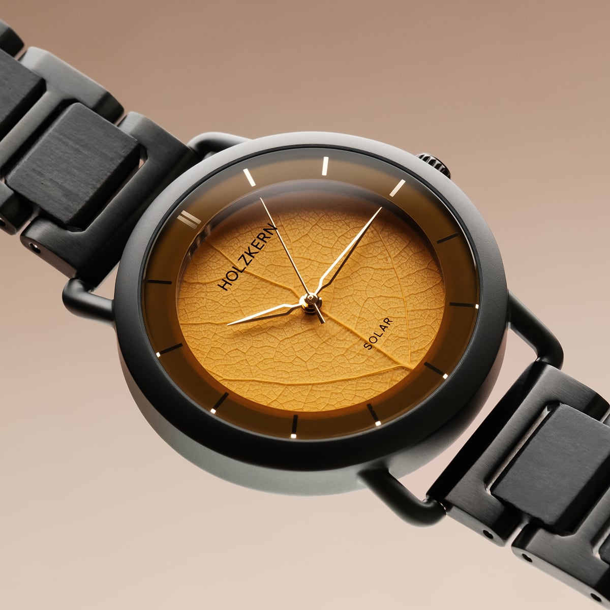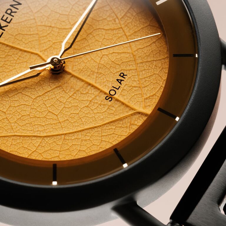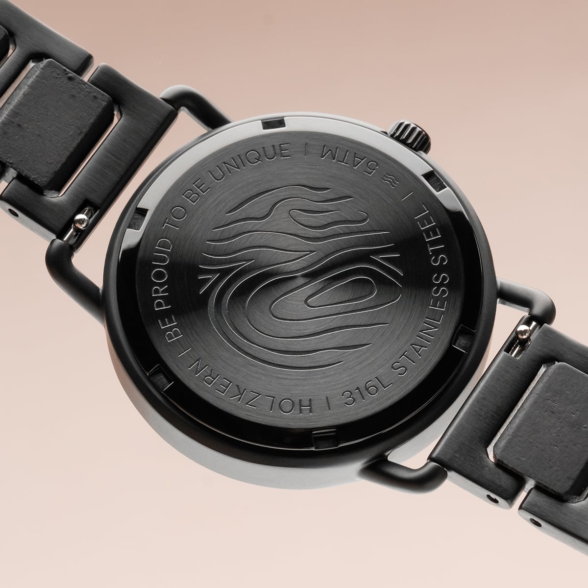 Precis som den förtrollade skogen som inspirerade till Lauri ger klockan uttryck för naturen i dess mest mystiska form: den bräckliga strukturen hos ett äkta löv som bevarats för evigheten som en unik urtavla. Med armband av rostfritt stål och äkta trä – starkt, jordande och beständigt. I mörkret lyser urtavlan upp och väcker tiden till liv i form av ett mystiskt ljusspel, som svarta jätteträd mot fullmånen som klättrar på himlen.