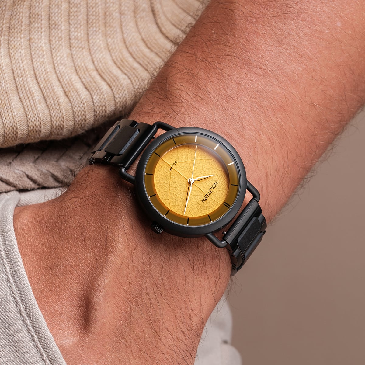Ren natur! Poppelfikonet, som också är känt som en traditionell symbol inom buddhismen, växer i Asien och används ofta som prydnadsväxt i parker, tempel och på gator. Trädet används också som dekoration för våra klockor, eftersom dess blad färgas i olika färger och sedan torkas. De används sedan som urtavlor på våra klockor och för med sig naturen direkt till din handled!
