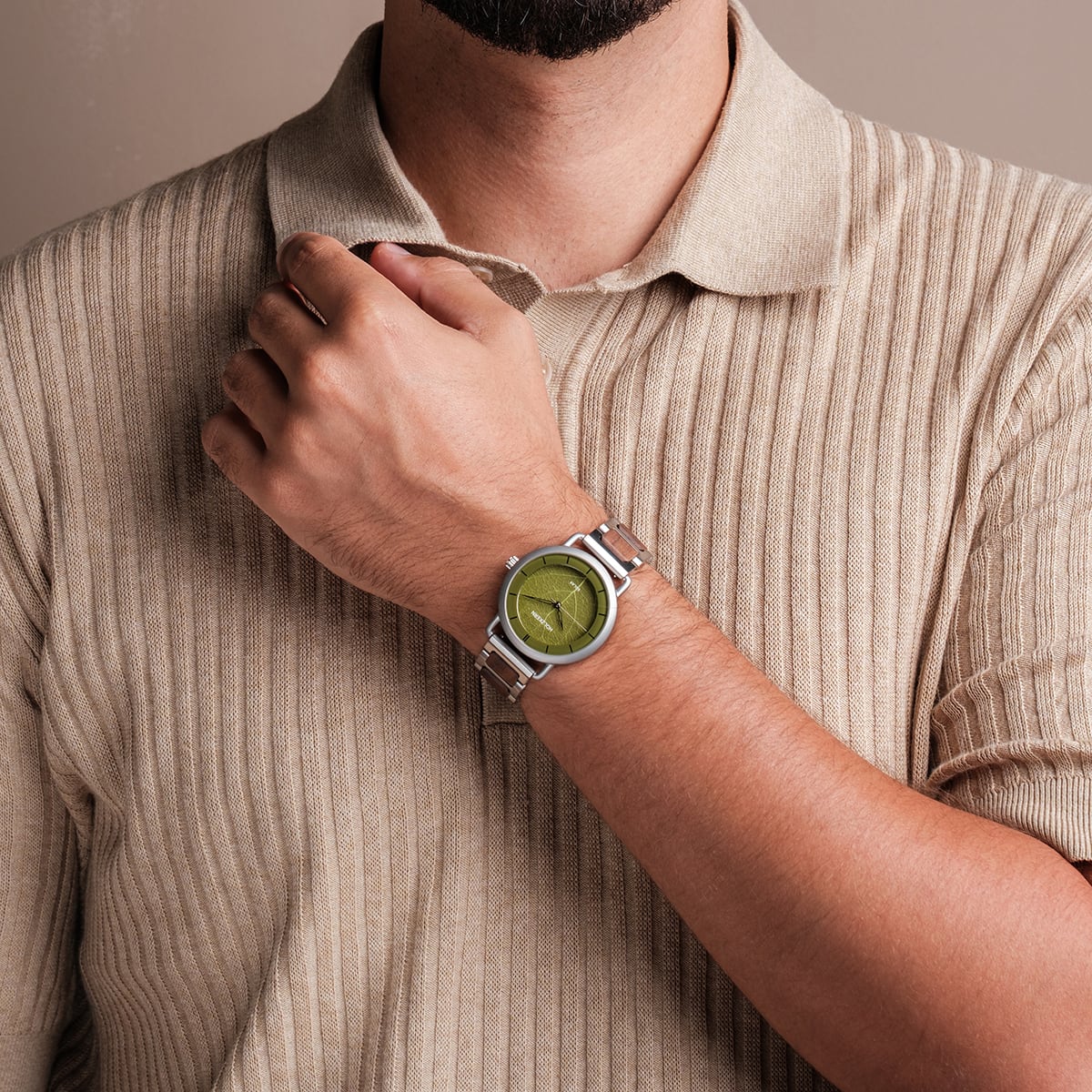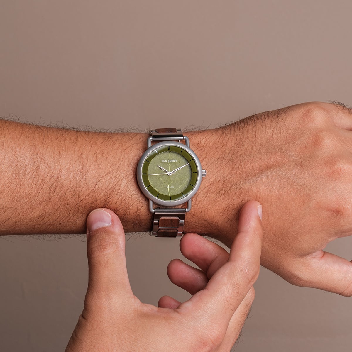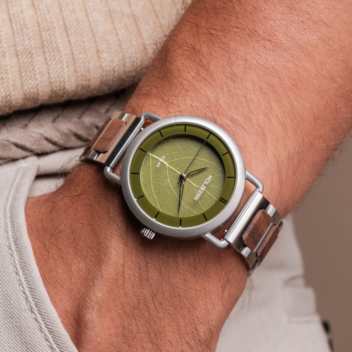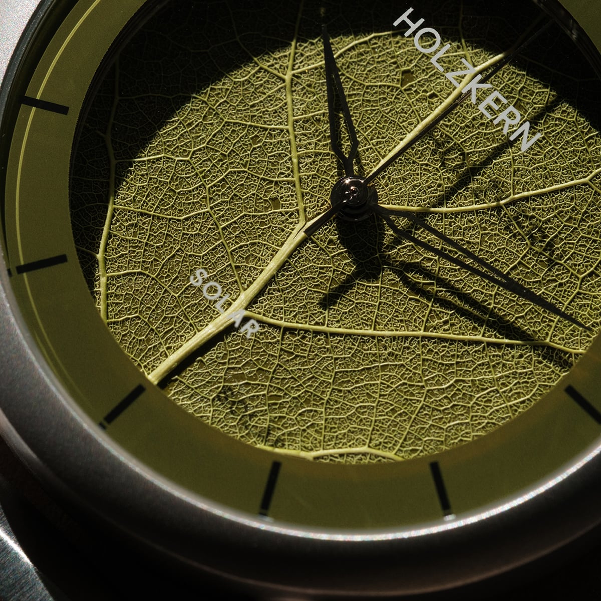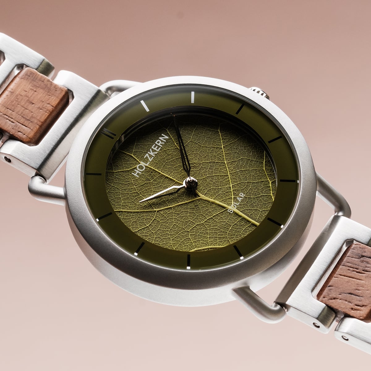 Precis som den förtrollade skogen som inspirerade till Lauri ger klockan uttryck för naturen i dess mest mystiska form: den bräckliga strukturen hos ett äkta löv som bevarats för evigheten som en unik urtavla. Med armband av rostfritt stål och äkta trä – starkt, jordande och beständigt. I mörkret lyser urtavlan upp och väcker tiden till liv i form av ett mystiskt ljusspel, som svarta jätteträd mot fullmånen som klättrar på himlen.
