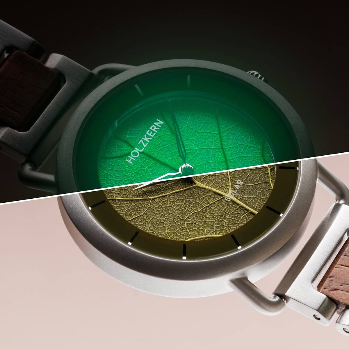 Särskilda pigment absorberar UV-ljus och artificiellt ljus, och får urtavlan att lysa. Din naturprodukt följer inte bara med hela dagen, utan är också en trogen följeslagare på kvällar och nätter och lovar en exakt avläsning av tiden.