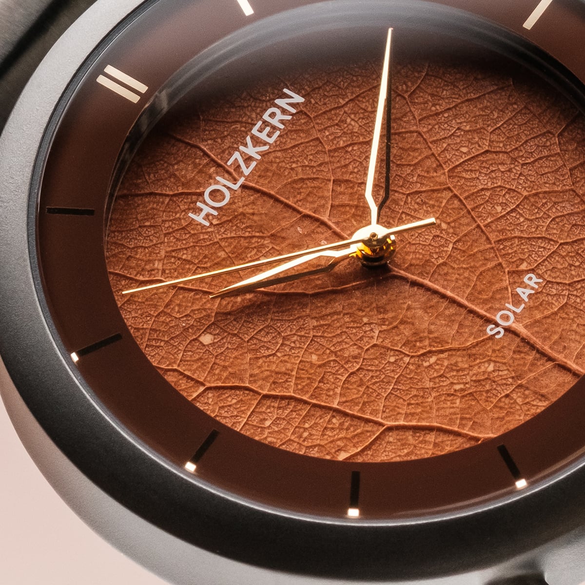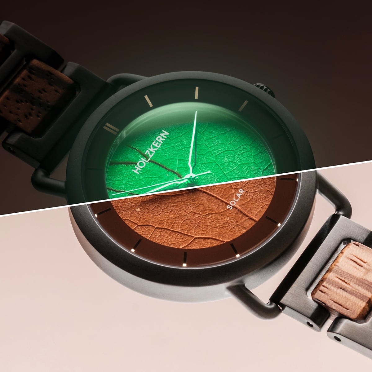Zoals het sprookjesbos dat haar inspireerde, legt Lauri de natuur vast in haar meest mysterieuze vorm: het fragiele skelet van een echt blad, tot in de eeuwigheid bewaard en omgevormd tot een unieke wijzerplaat. Daarbij een horlogeband van roestvrij staal en echt hout: sterk, aardend en duurzaam. In de duisternis licht de wijzerplaat op, waardoor tijd en wijzers er donker tegen afsteken – een mystiek lichtspel, als zwarte bomen voor de opkomende volle maan.