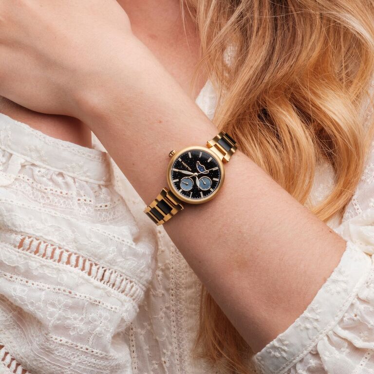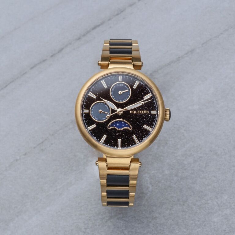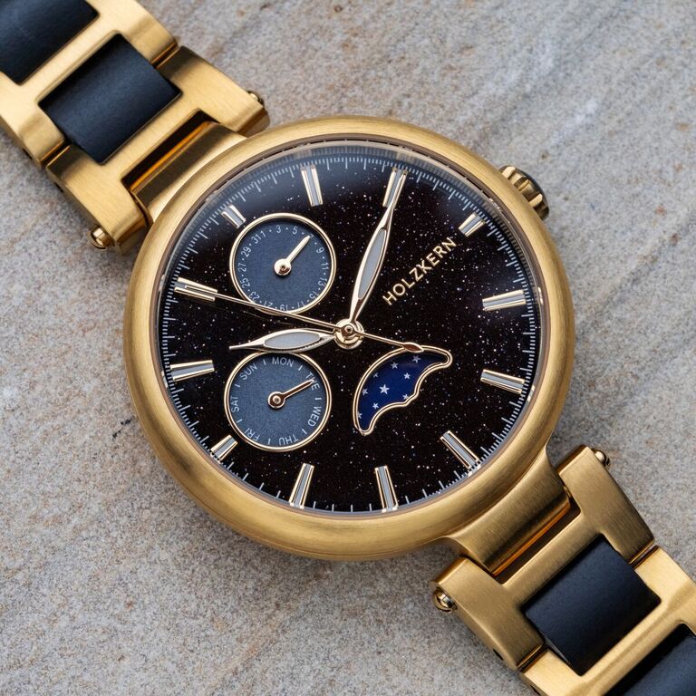 Med svart aventurin, lönn och pärlemor fångar din Moonbow precis det här ögonblicket. Månfasvisningen för med sig månens resa till din handled, medan det gyllene rostfria stålet representerar stjärnornas gnistrande.