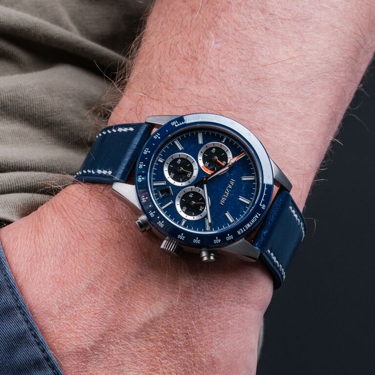 Neverrest er klar. Klar til at sejle ud med dig! Det blå design vækker minder om oceanets dybder, hvor marmor, keramik og ægte læder danner lærredet for dine maritime eventyr. Men det sande hjerte er urkassen i titanium. Med en særlig belægning opnår den en hårdhed på over 1000 HV og forener dermed to modsætninger til perfektion: ultralet og samtidig ekstraordinært ridsefast. Indeni Neverrest sikrer et meca-kvarts kronografværk moderne præcision med klassisk charme – hvor tiden måles kvartsdrevet, mens stopfunktionen betjenes mekanisk.