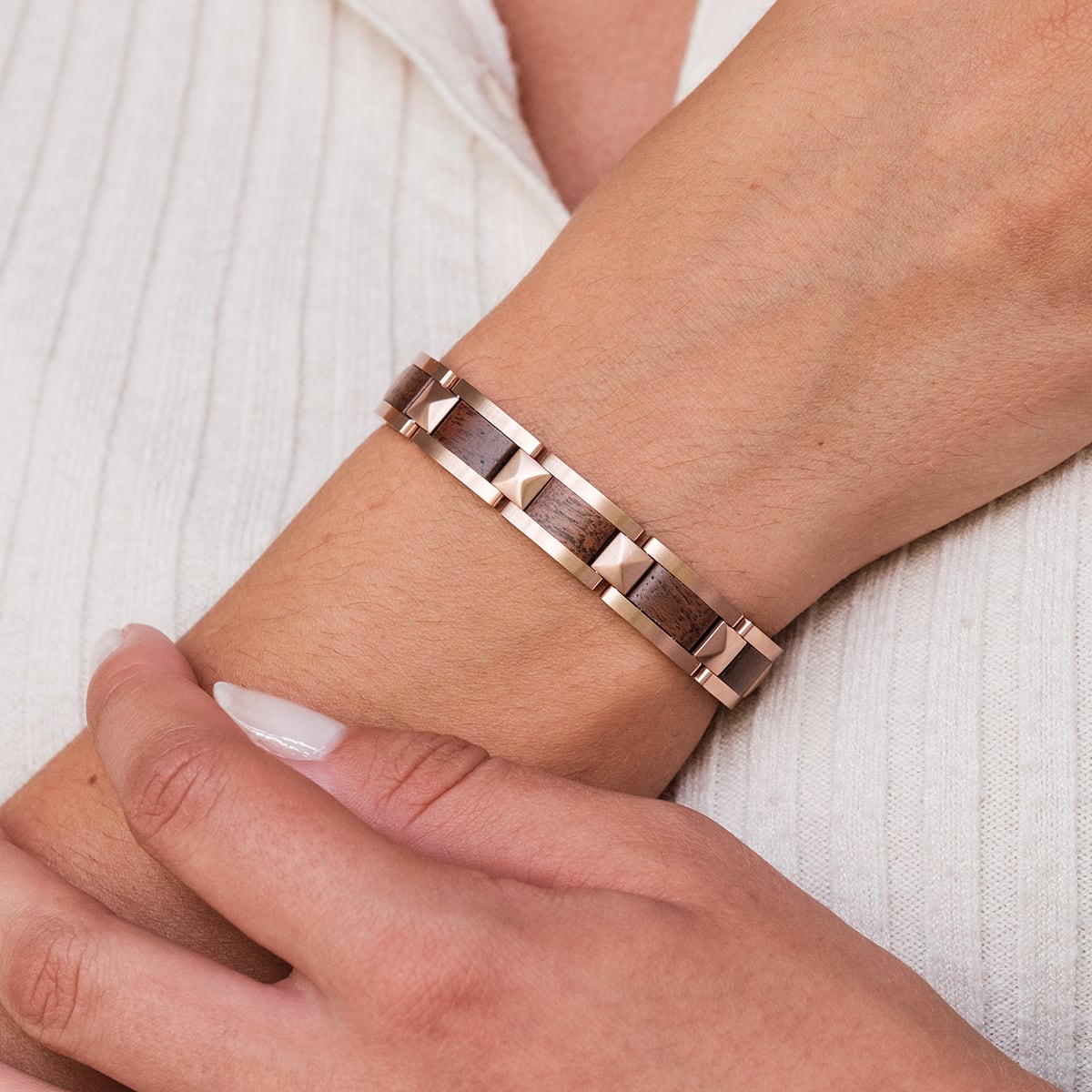 Tillverkat av fint valnötsträ och högkvalitativt rostfritt stål i roséguld är det här en armlänk med en otrolig kombination av slående färger och raffinerad design, avsedd att fängsla. Armlänken Rhapsody passar perfekt för att ge en elegant touch till din vardagsklädsel eller för speciella tillfällen. Bär den som en vacker påminnelse om de viktigaste sakerna i livet, eller ge den som en gåva till en speciell person.