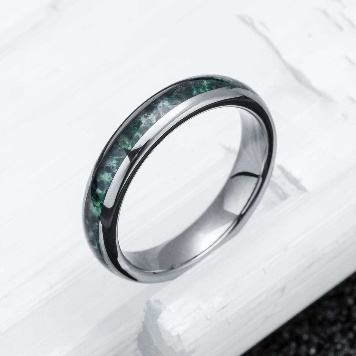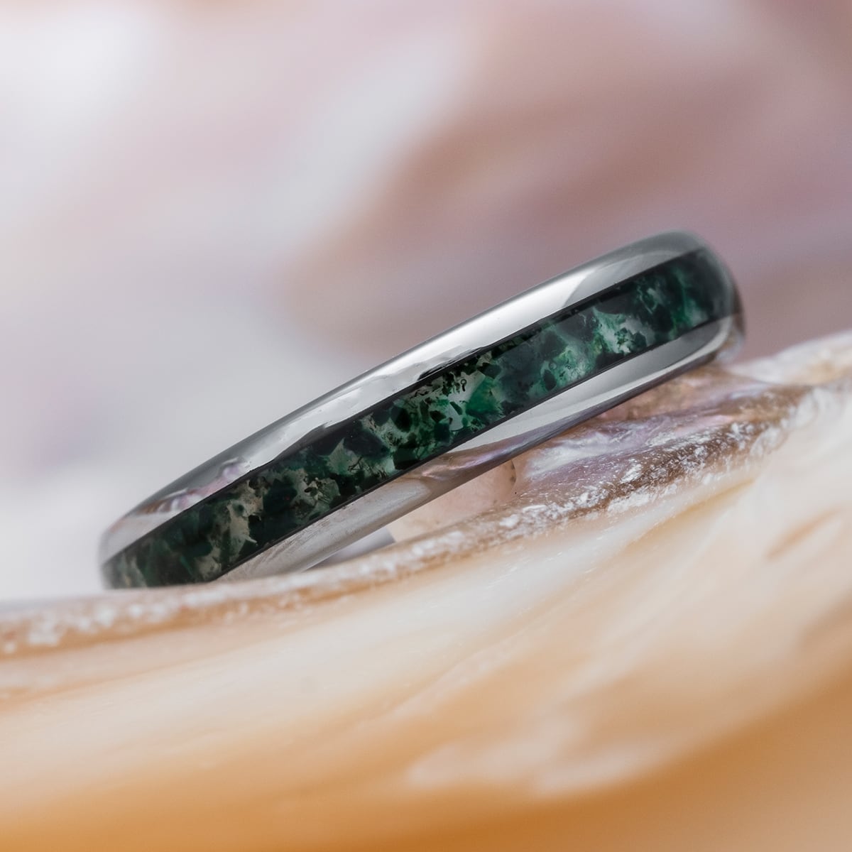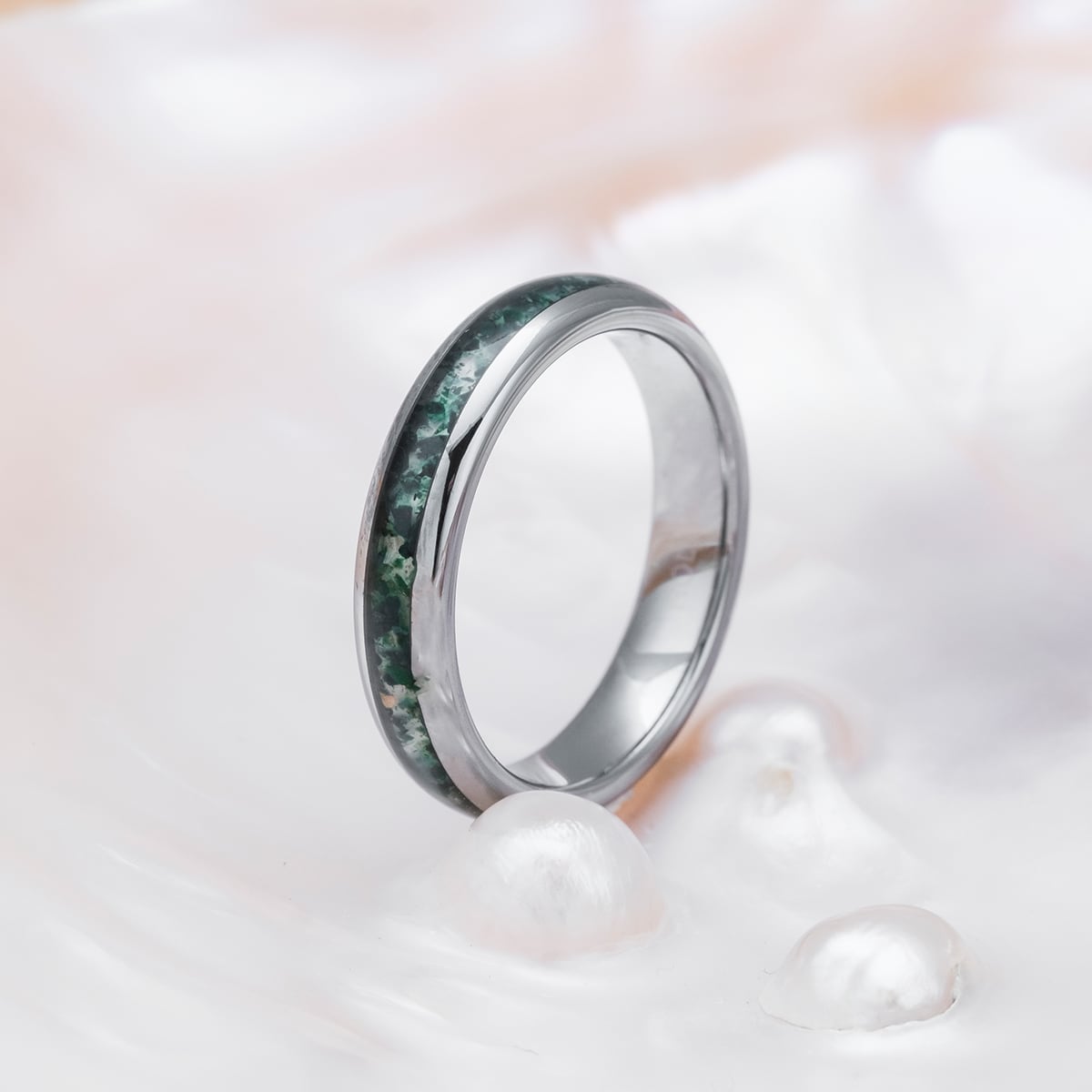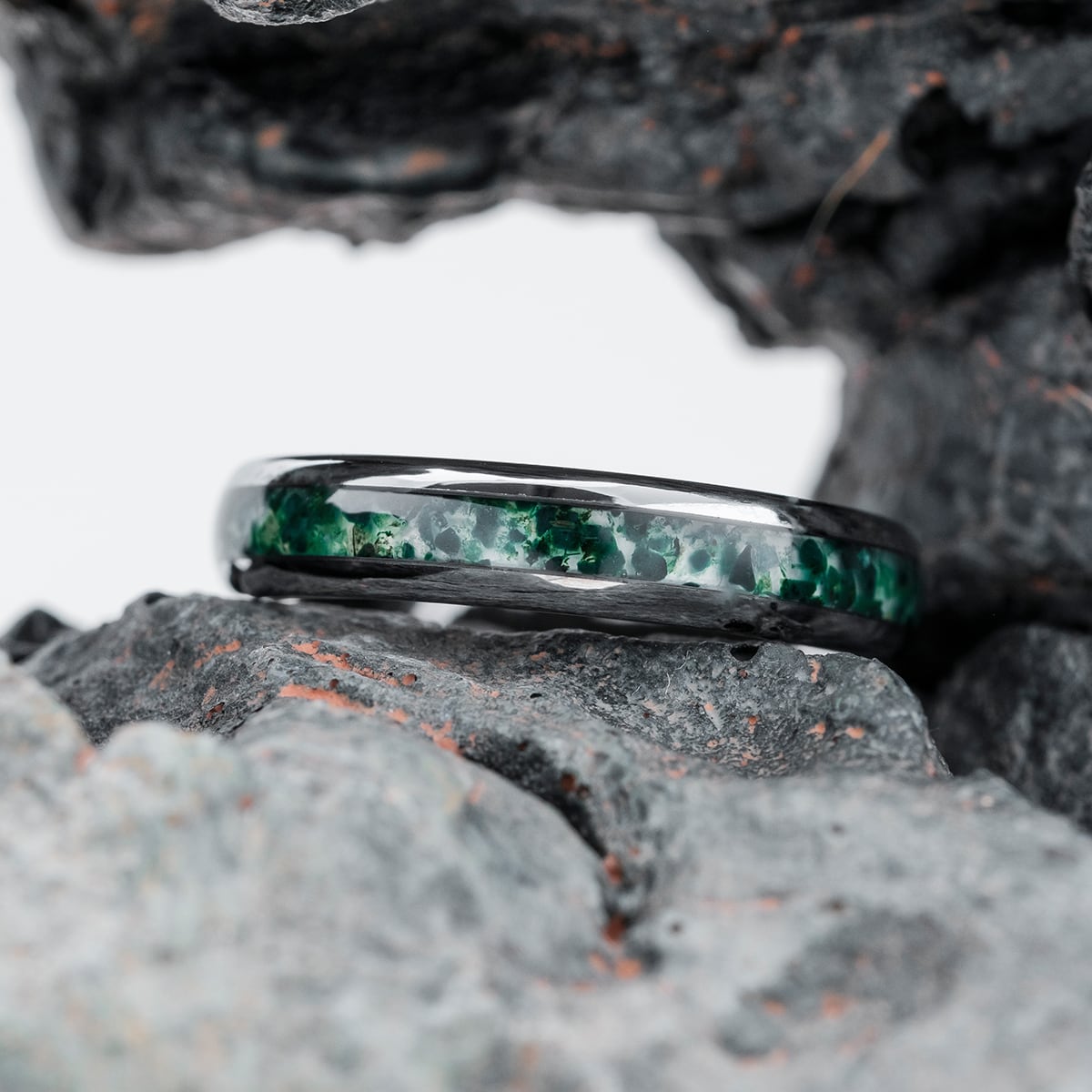 Som en sval hälsning från en bergsgrotta påminner vår ring för kvinnor om naturens lugn och styrka. Med sin klara, minimalistiska design och samspelet mellan äkta mossagat och det robusta smyckesmetallen volfram står Sumo för balans, karaktär och tyst styrka.