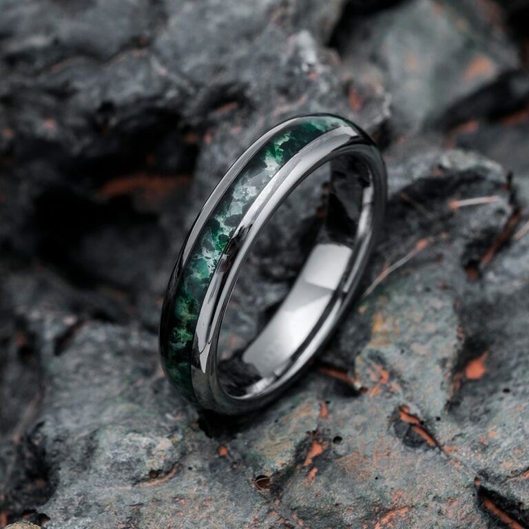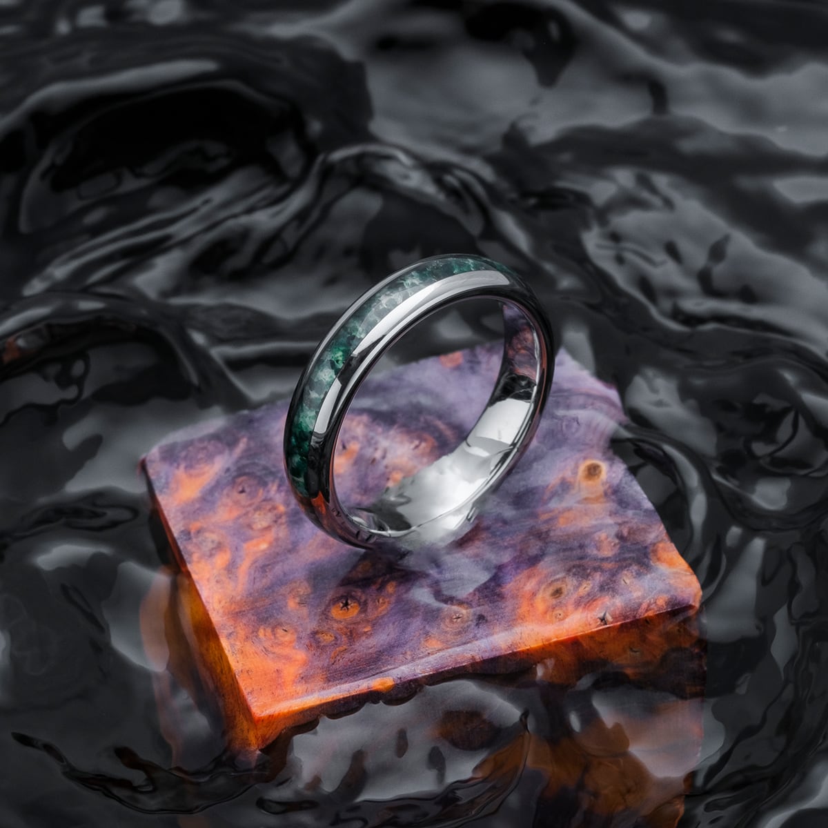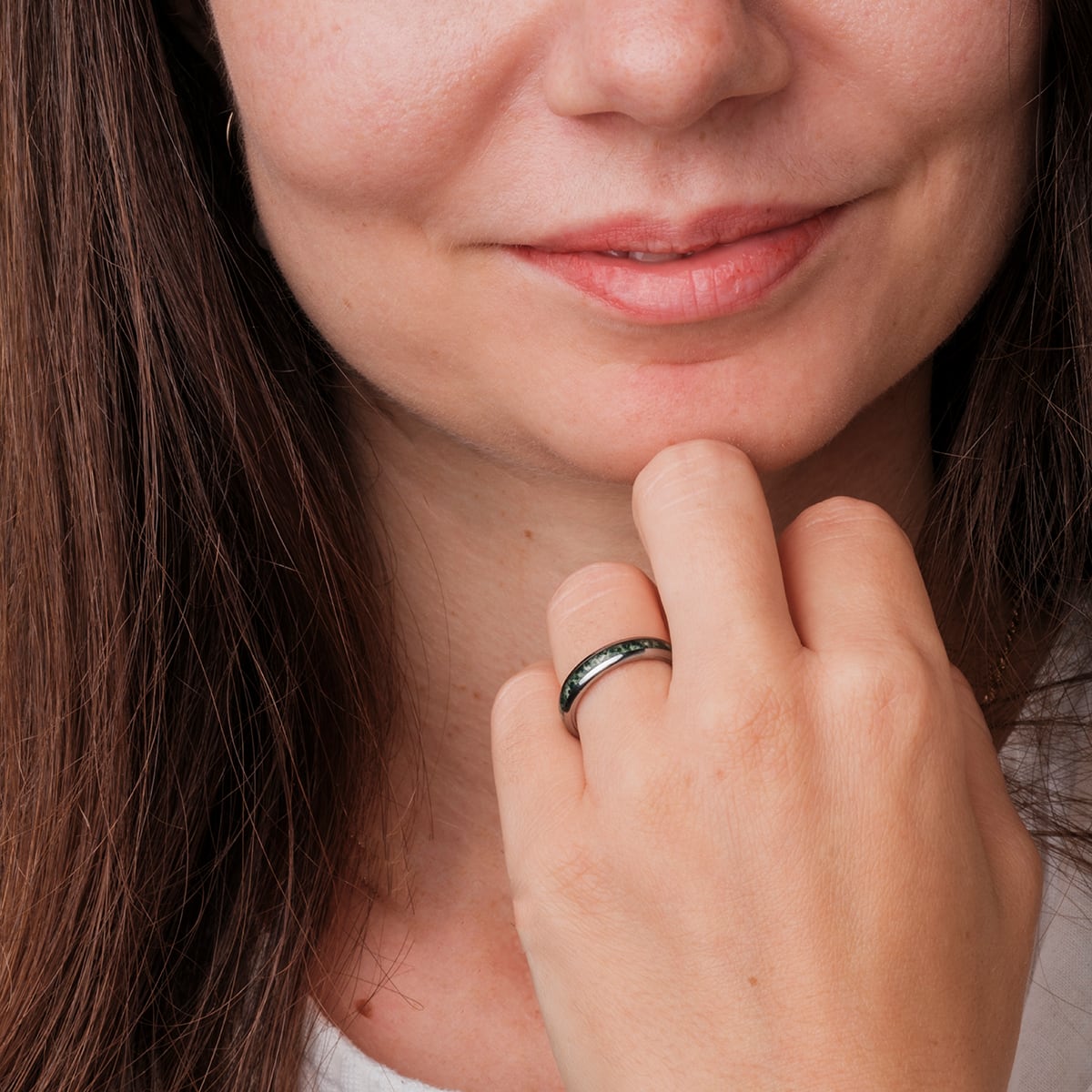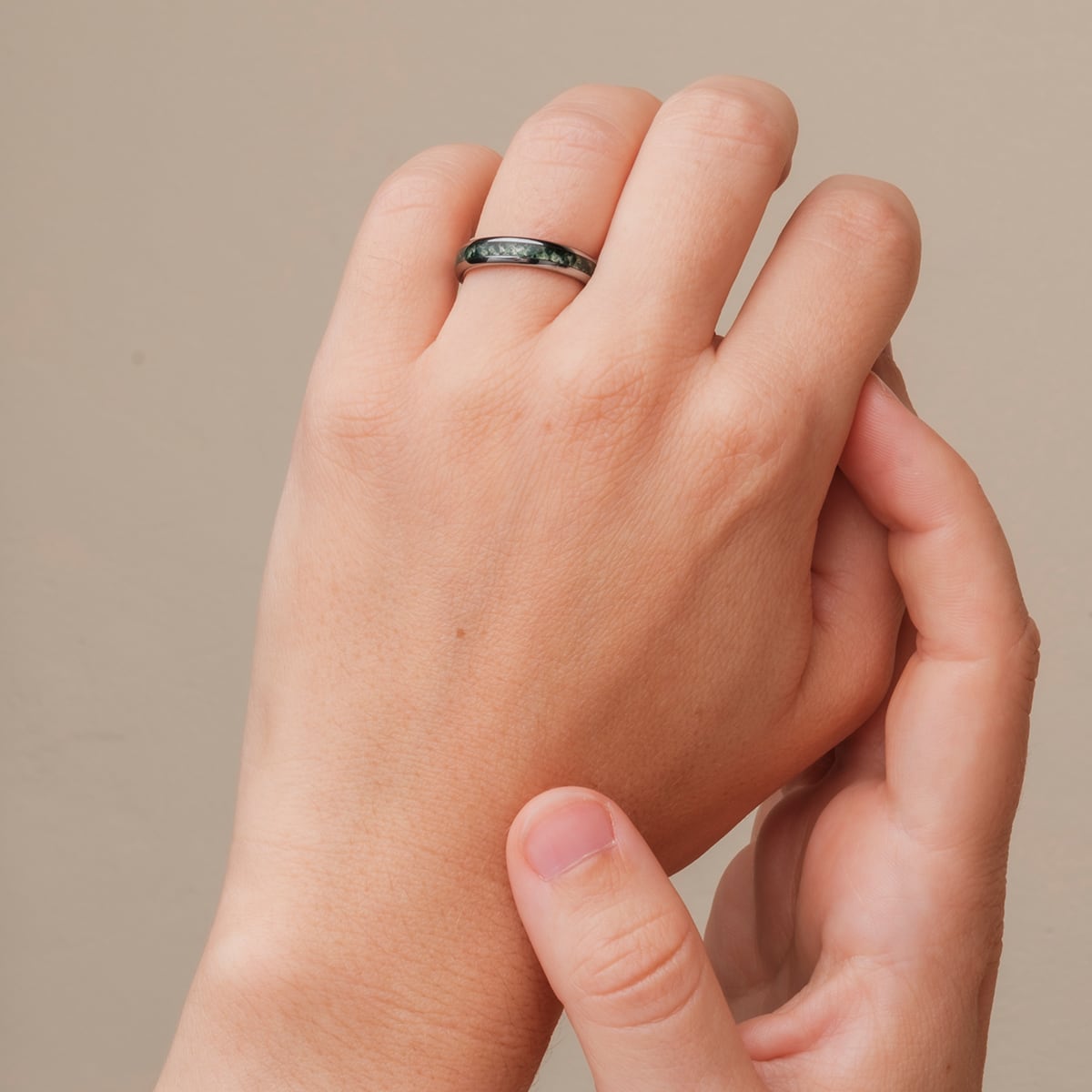Som en sval hälsning från en bergsgrotta påminner vår ring för kvinnor om naturens lugn och styrka. Med sin klara, minimalistiska design och samspelet mellan äkta mossagat och det robusta smyckesmetallen volfram står Sumo för balans, karaktär och tyst styrka.