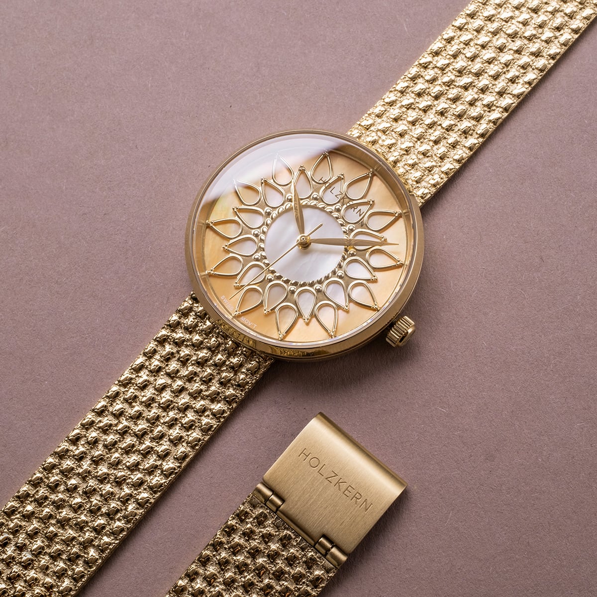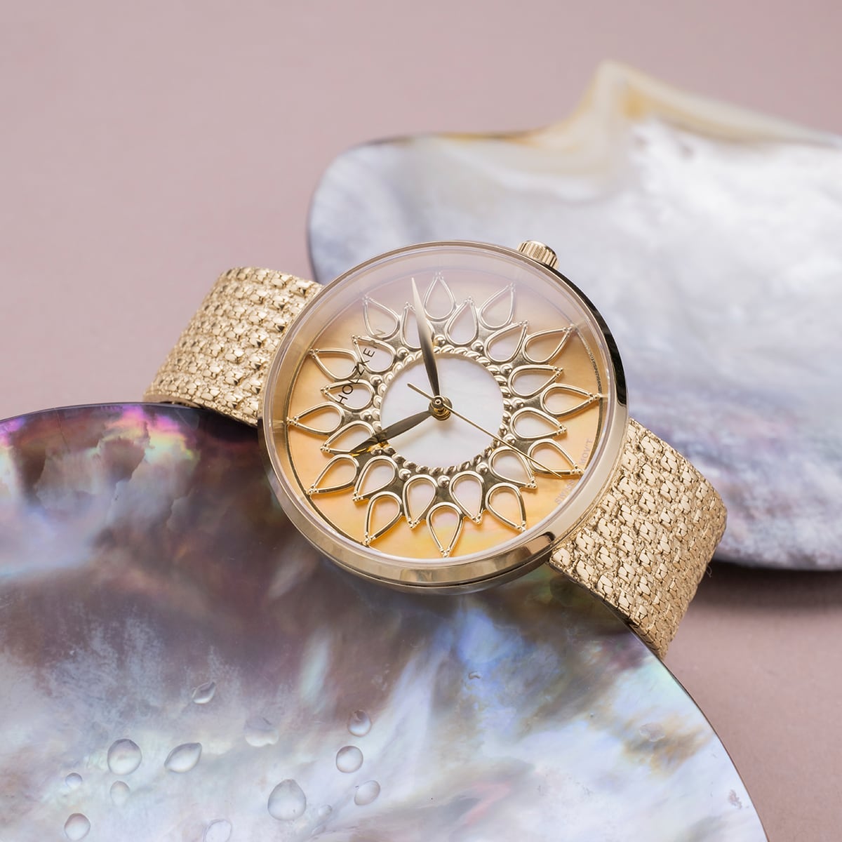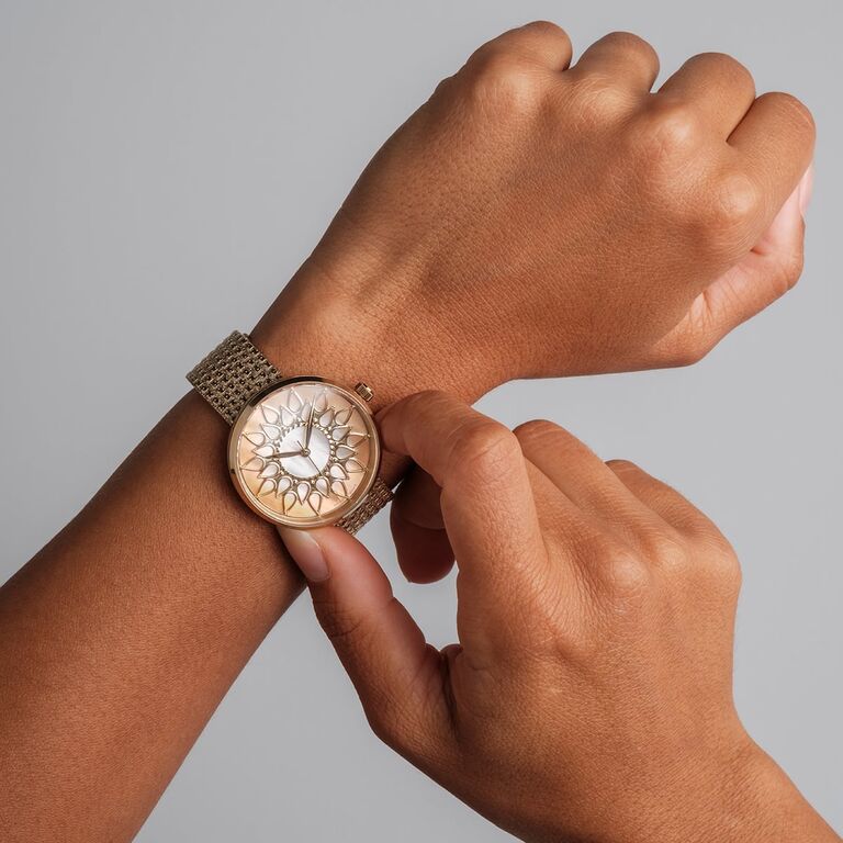 Inspirerad av vår mest populära smyckeskollektion … Denna klocka har allt som får dig att stråla. Det pärlemorskimrande ljuset som dansar i solljuset, solrosens form på urtavlan eller det schweiziska urverket i dess inre – varje detalj påminner dig om hur vackert och färgglatt livet kan vara.
