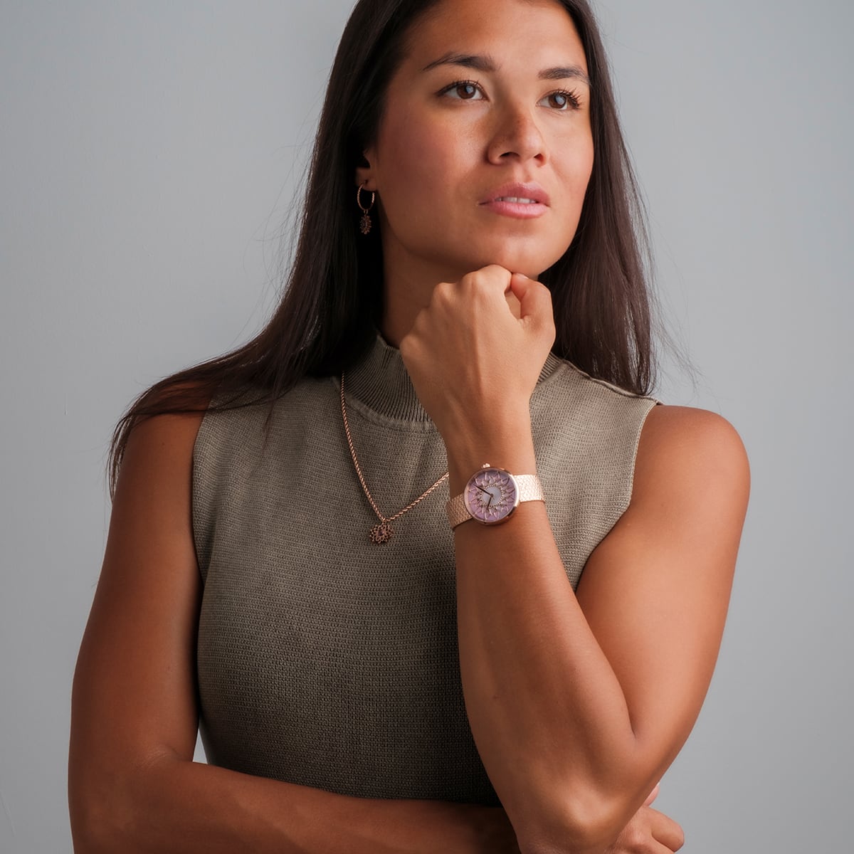 Suncatcher är ett strålande statement för livsglädje, elegans och naturlighet. Den är tillverkad av pärlemor och rostfritt stål, förädlad med reptåligt safirglas och är vattentät ner till 5 ATM och följer dig med varje steg – lätt, färgglad och tidlöst vacker. För alla som inte söker ljuset i vardagen, utan bär det med sig.