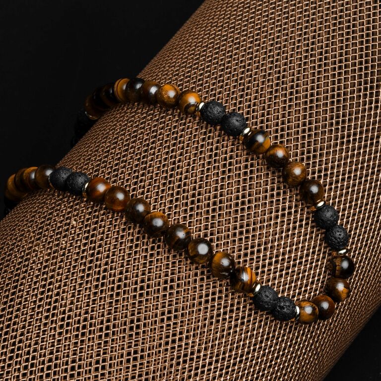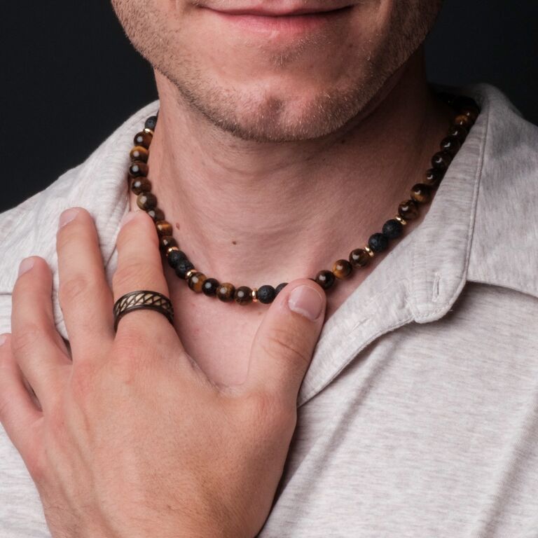 Halsband i gyllenbrunt tigeröga som bjuder på varma toner och starka kontraster. Guldfärgade mässingsdetaljer ger en elegant och uttrycksfull look. För dig som är lika uttrycksfull som stilsäker – bär ensamt eller matcha med andra smycken. Stänksäker, justerbar och designad för rörelse.