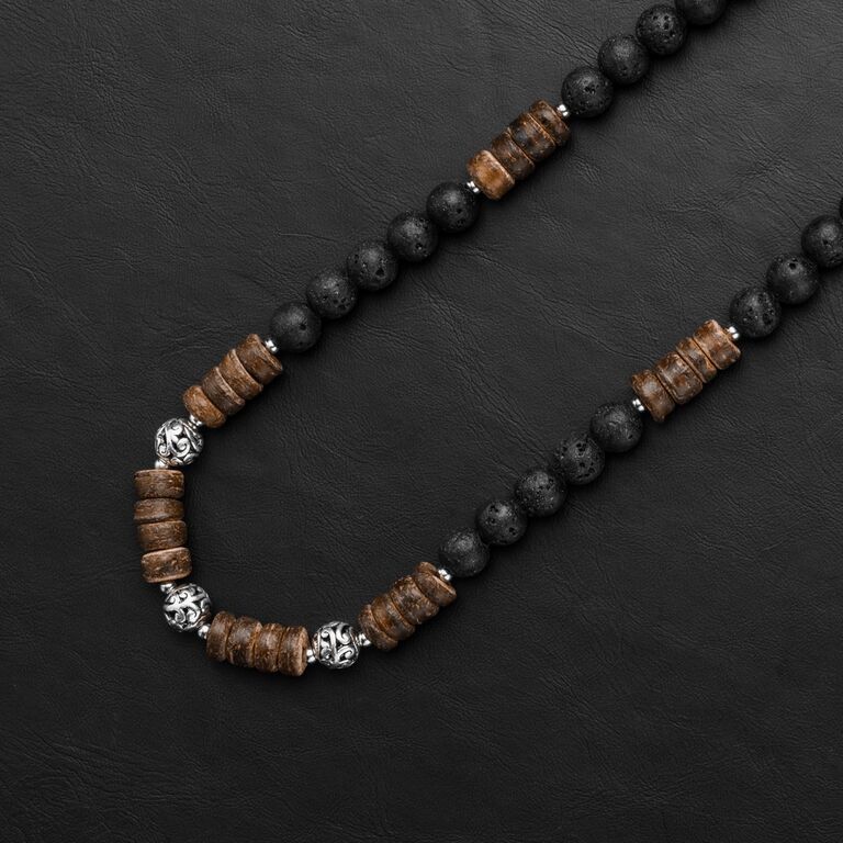Rå, jordnära, enkel: Detta halsband kanaliserar elementär energi med mattsvarta lavastenar och naturliga pärlor av kokosnötsskal. Minimalistiska silverfärgade detaljer i mässing fulländar utseendet, medan den justerbara längden ger frihet att styla.