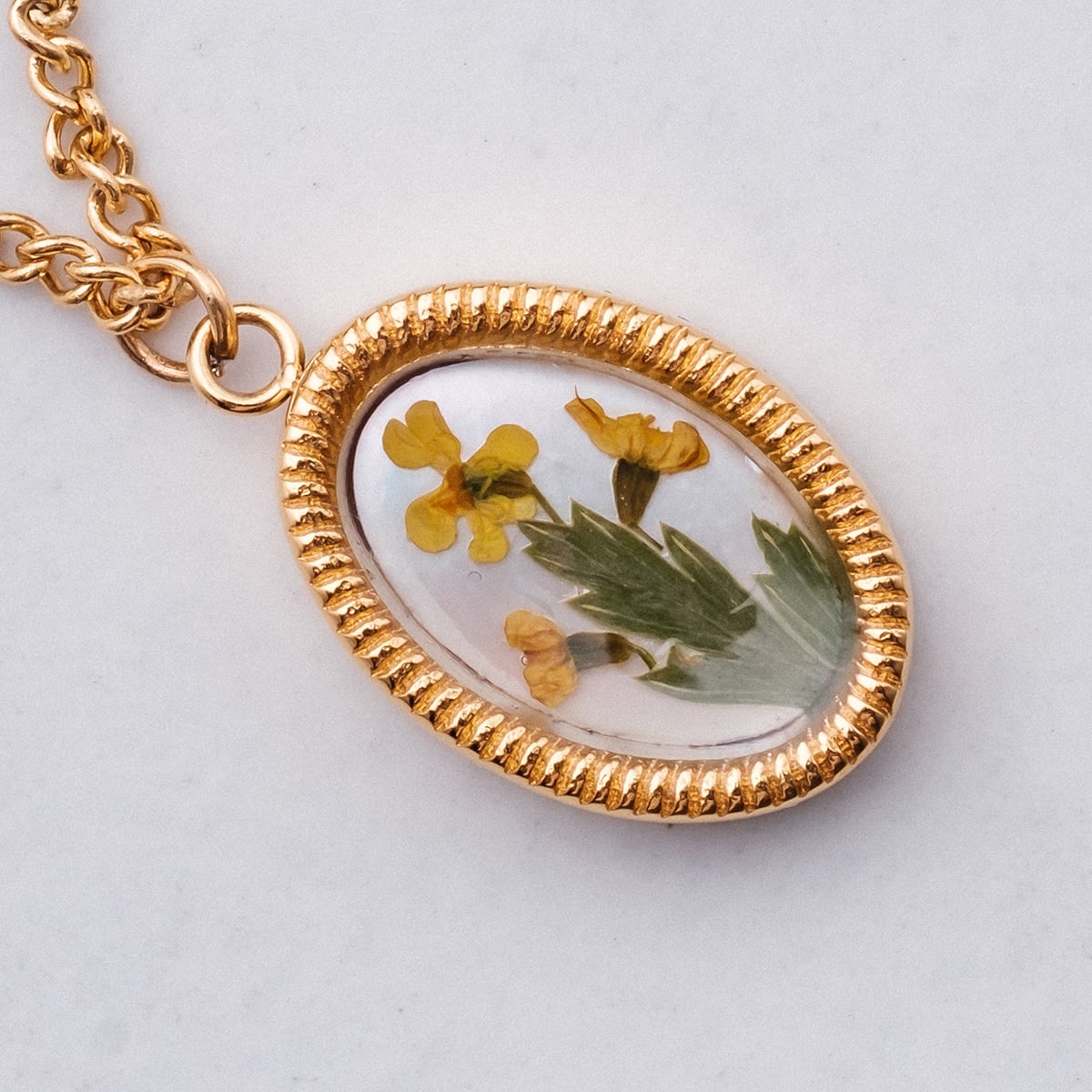 Med äkta anthocercis och ormbunke, skimrande pärlemor och guldpläterat rostfritt stål blir detta blomstrande smycke en daglig påminnelse om livets vilda skönhet. Perfekt för alla som sveper genom vardagen med lätthet – och stannar upp när växterna blommar i vägkanten.